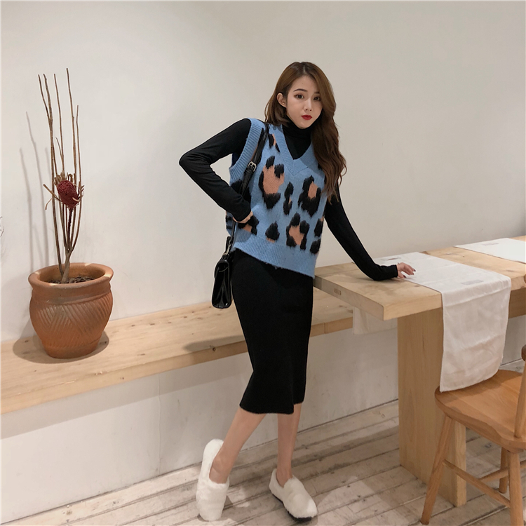 / 時尚撞色V領無袖豹紋針織背心馬甲+高領打底衫+針織包臀裙三件套