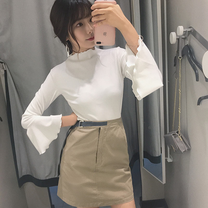 / 2018秋季新款韓范修身半高領打底衫百搭喇叭袖學生套頭t恤上衣女
