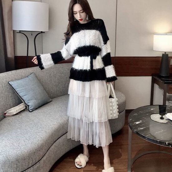 秋季套裝女時尚兩件套寬松長袖鏤空針織套頭慵懶條紋毛衣+蛋糕裙