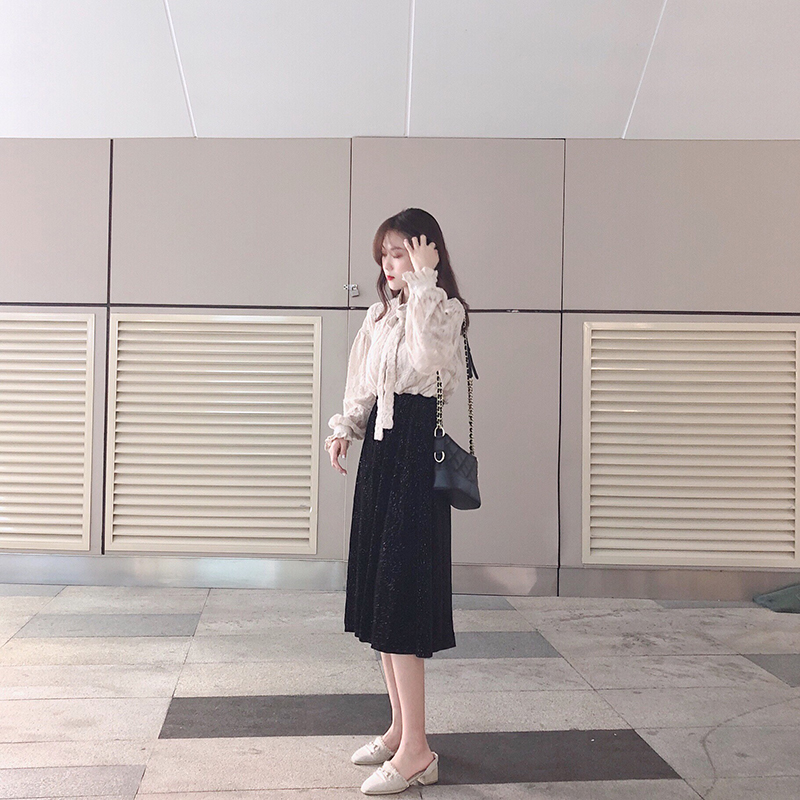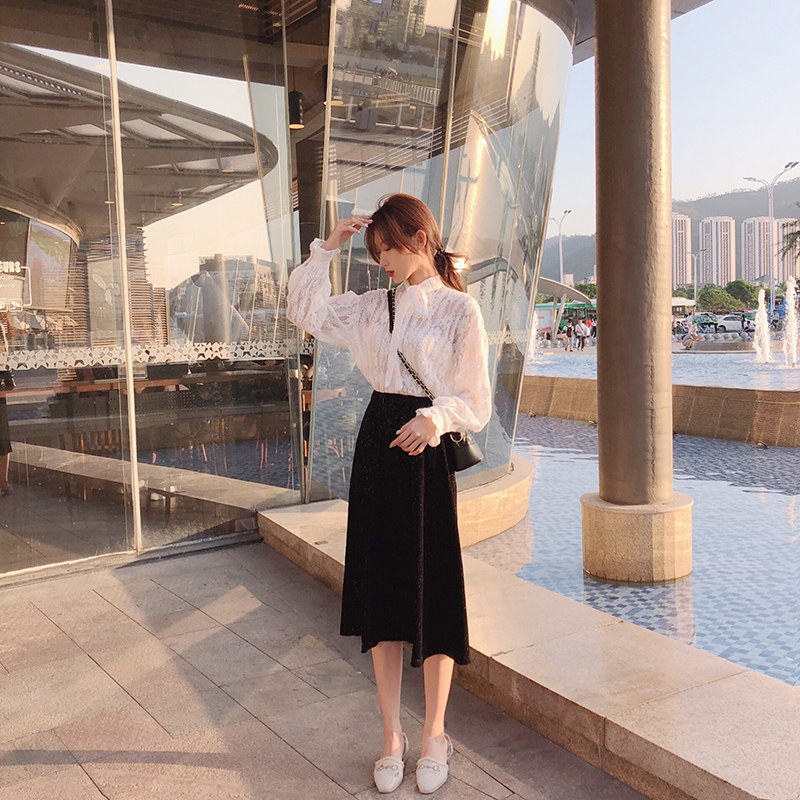 / 女神套裝新款襯衫蕾絲打底衫上衣+寬松顯瘦高腰絲絨半身裙女長裙
