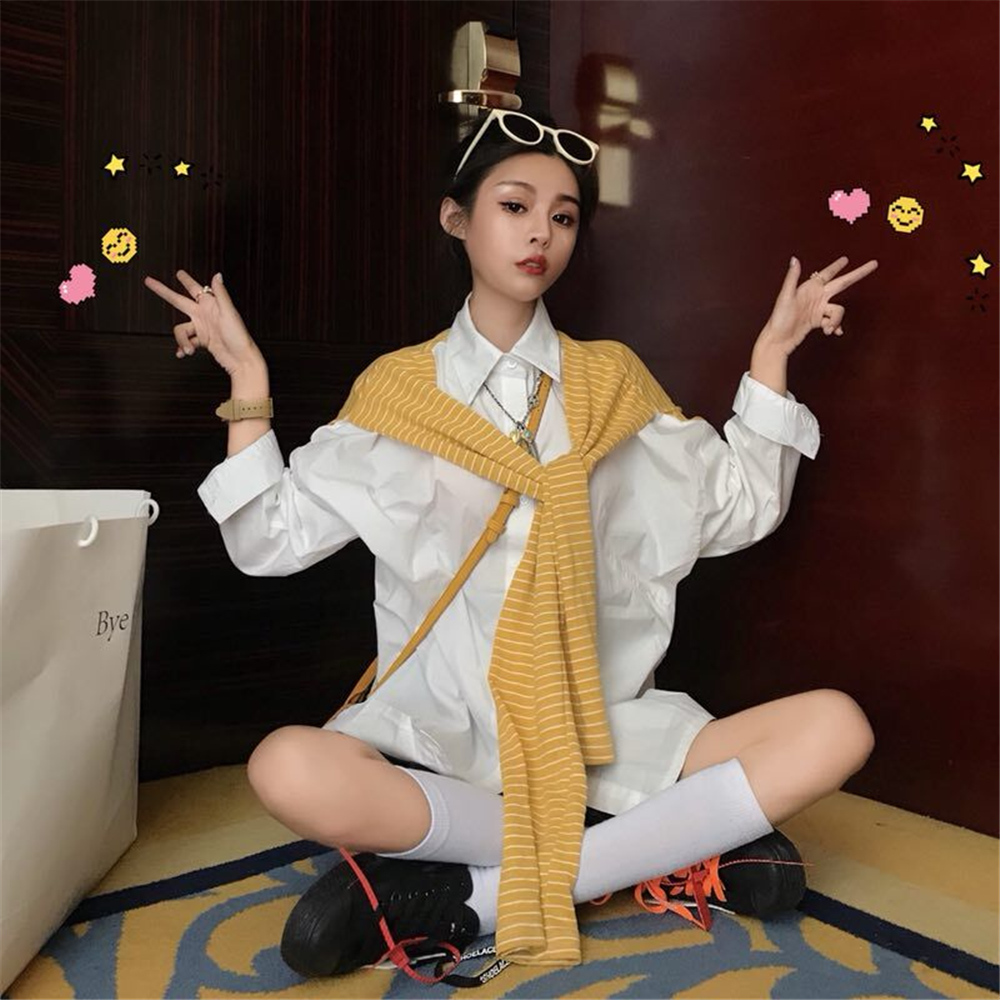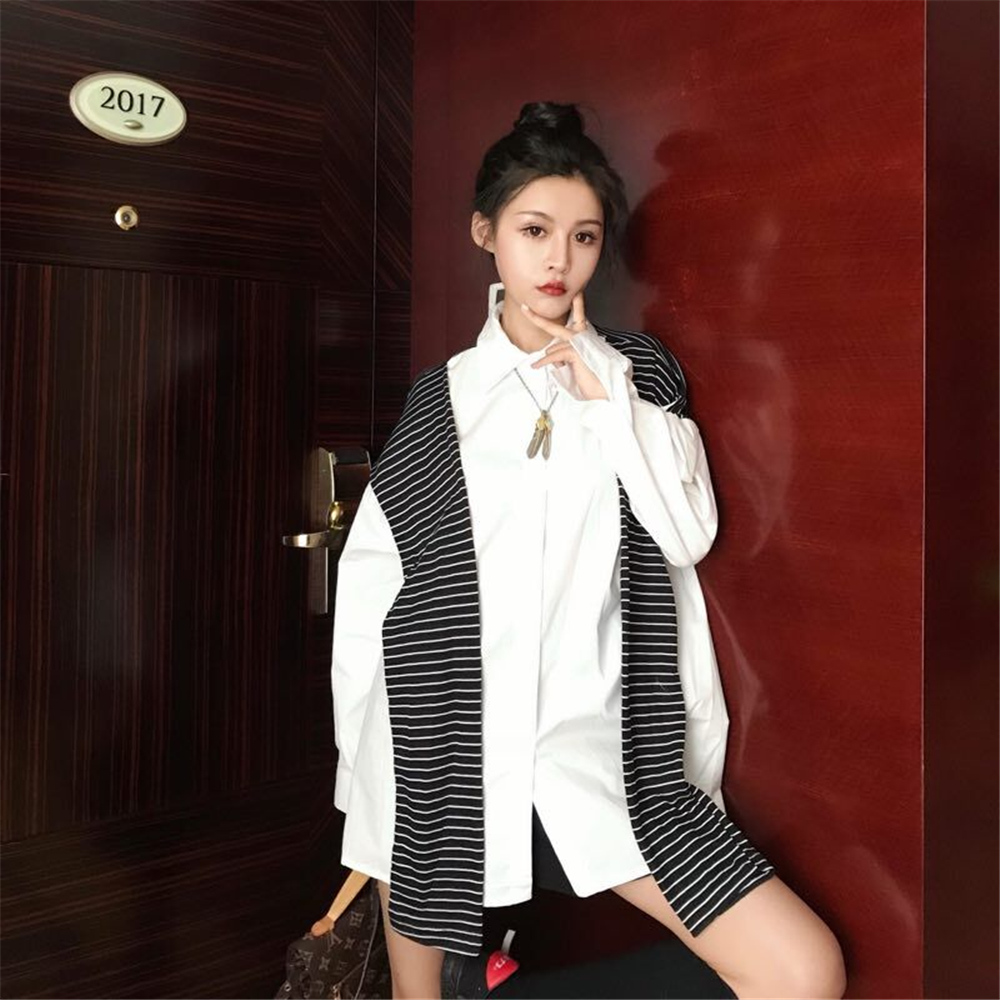 / 韓版時尚秋裝女2018新款港味條紋披肩拼接長袖寬松純色百搭襯衣潮
