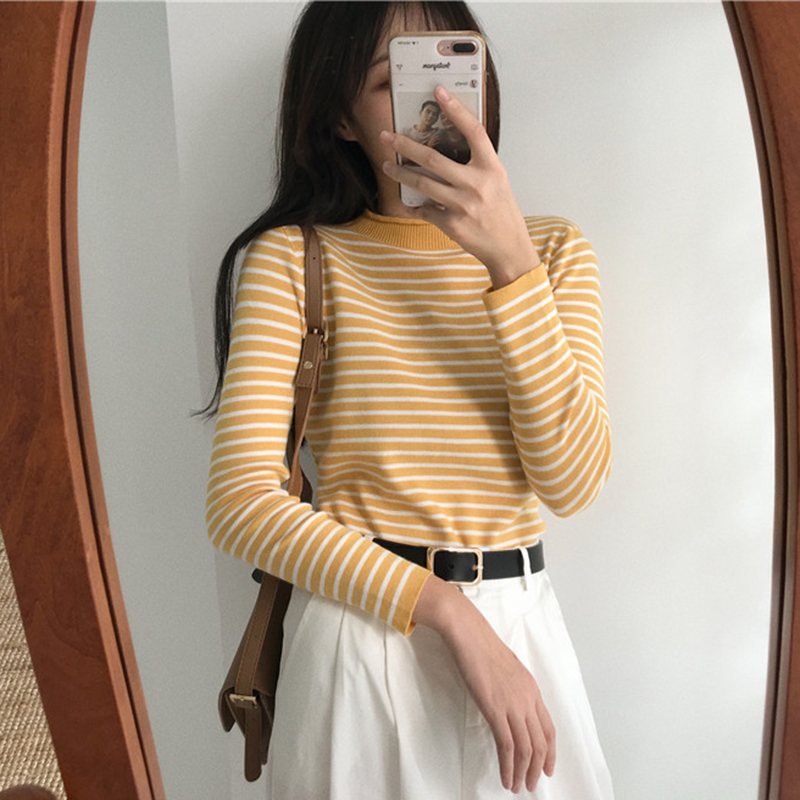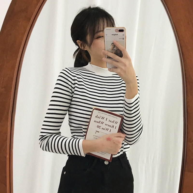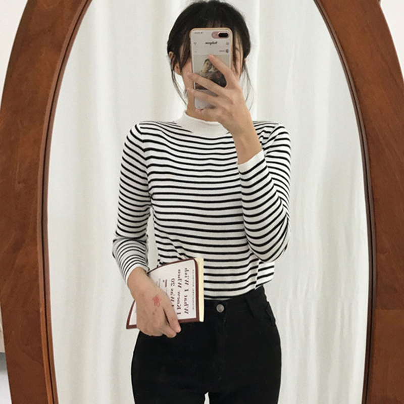 / 小高領長袖針織衫女秋冬裝新款修身顯瘦打底衫學生時尚條紋上衣潮