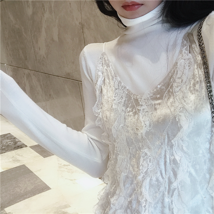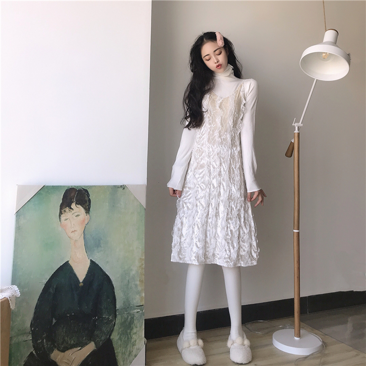 / 韓版時尚V領修身打底中長款性感吊帶連衣裙+純色針織打底衫兩件套