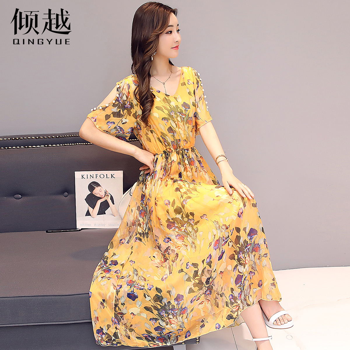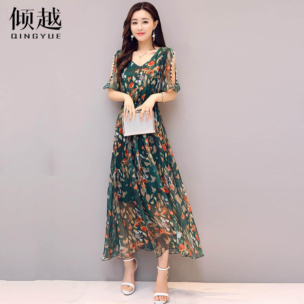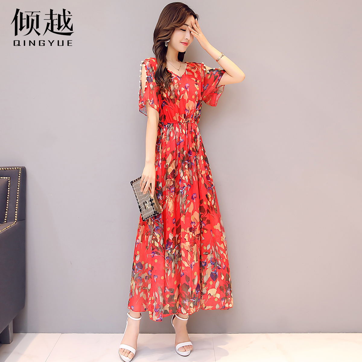夏季淑女V領碎花雪紡連衣裙女式松緊腰顯瘦長裙子釘珠短袖大擺裙