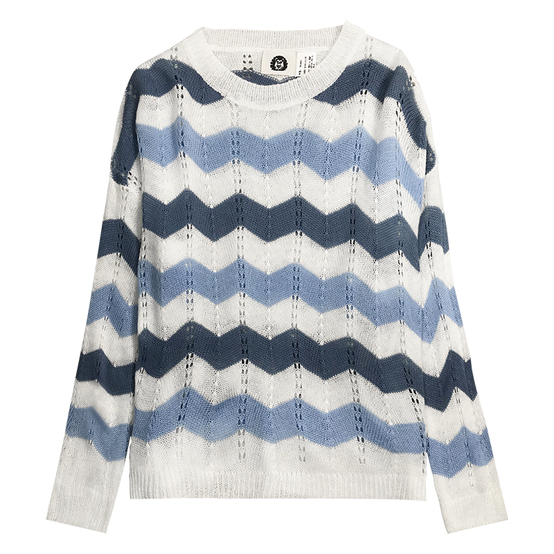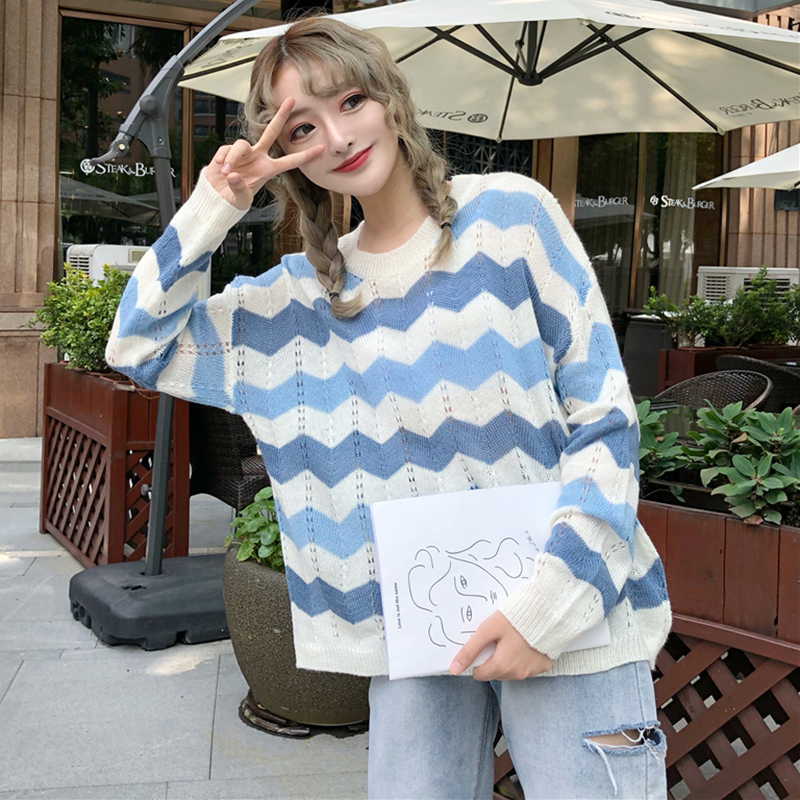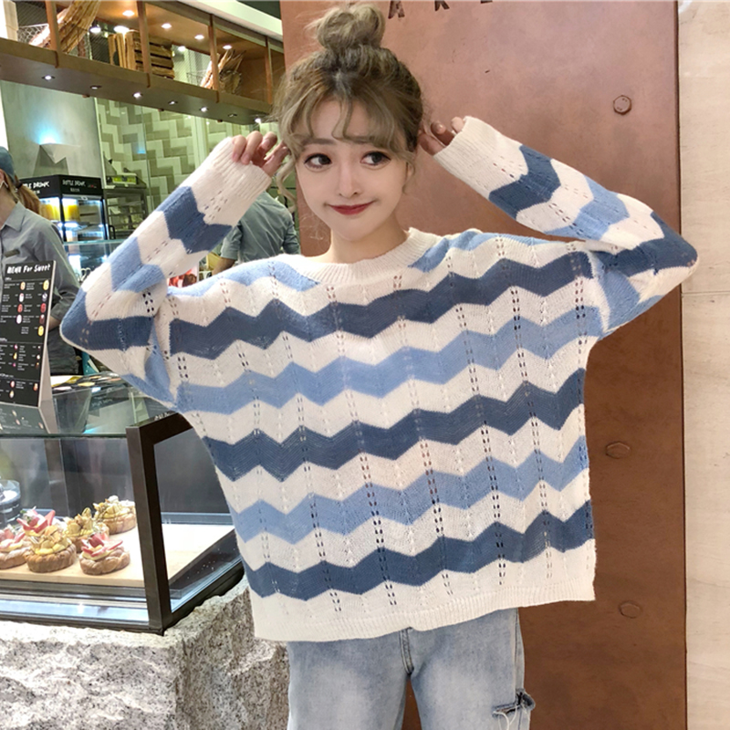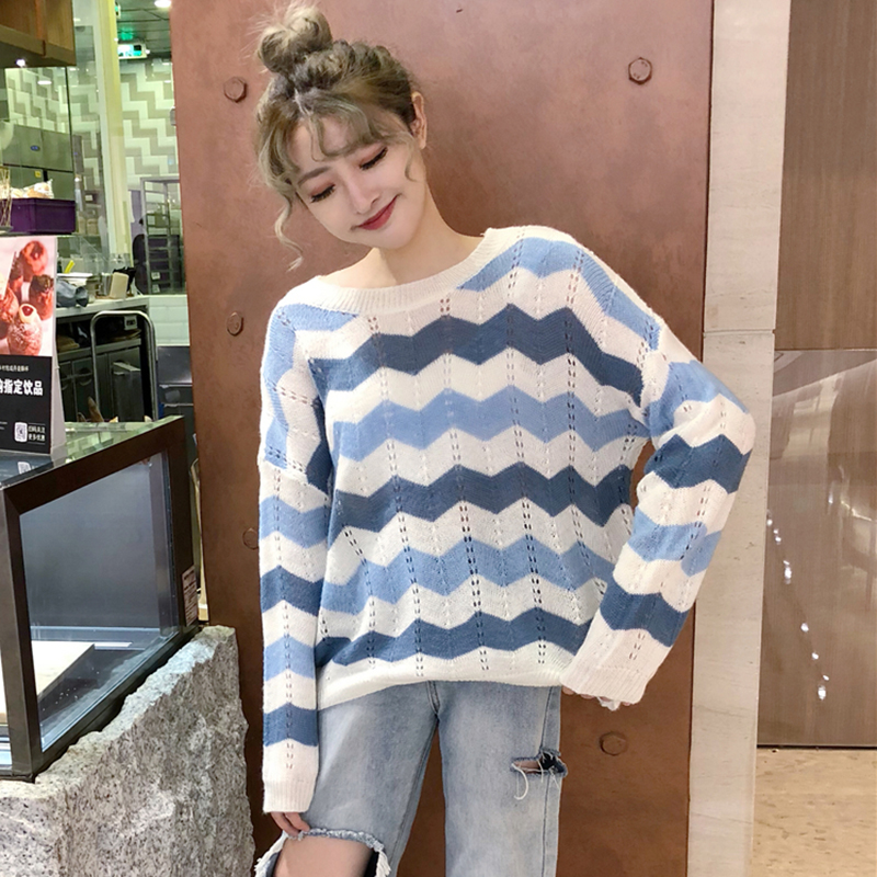 時尚針織衫秋裝女2018新款韓版寬松撞色條紋鏤空毛衣學生長袖上衣