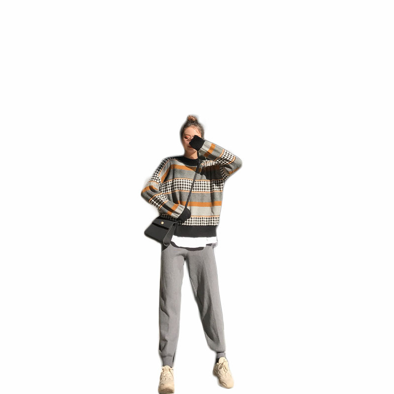 / 網紅同款秋裝女2018新款套裝包芯紗寬松針織上衣+百搭針織蘿卜褲