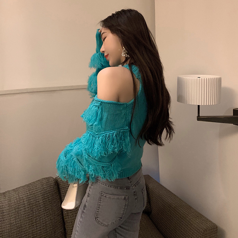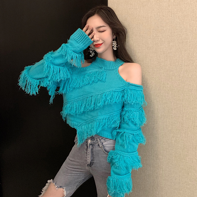 秋季新款女裝慵懶風時尚寬松套頭長袖上衣洋氣流蘇露肩短毛衣外套