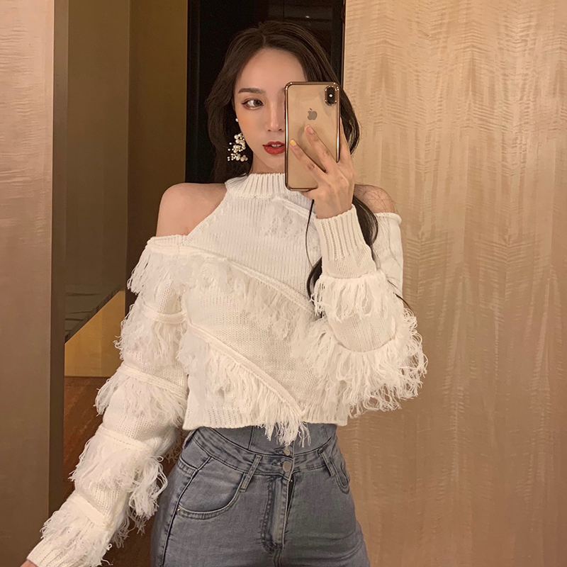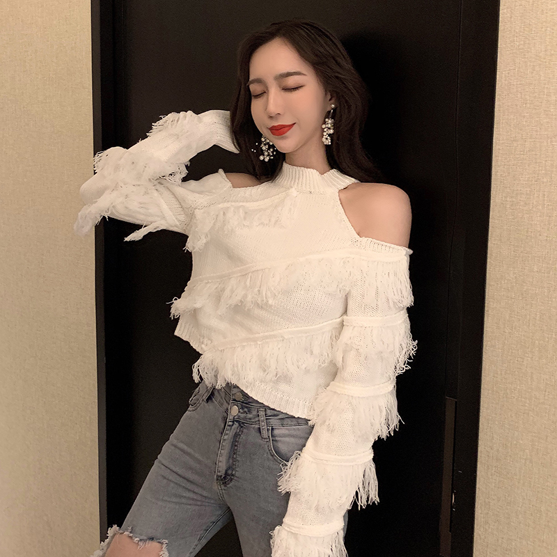 / 秋季新款女裝慵懶風時尚寬松套頭長袖上衣洋氣流蘇露肩短毛衣外套