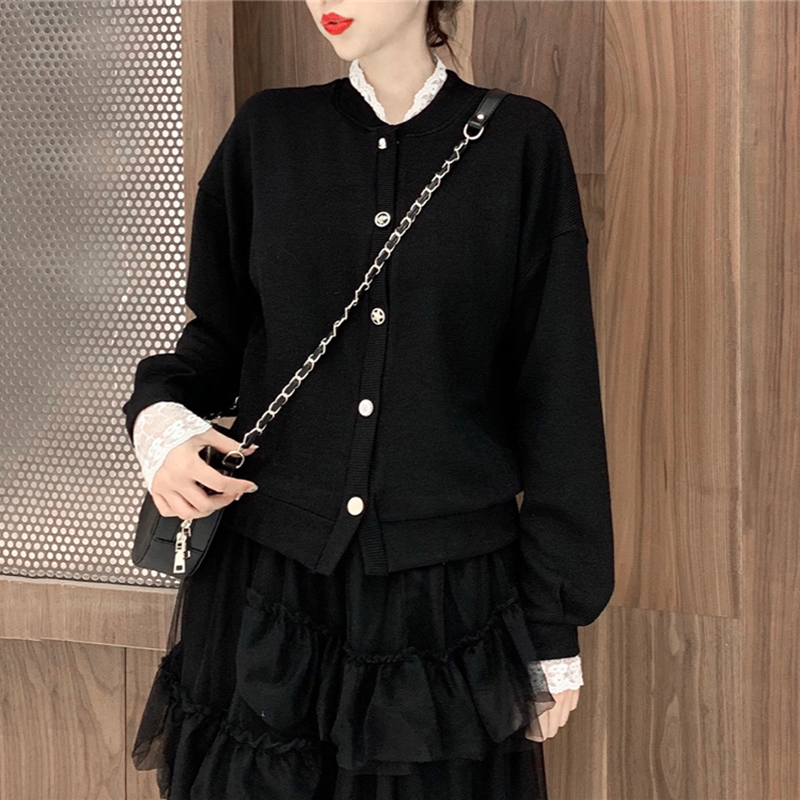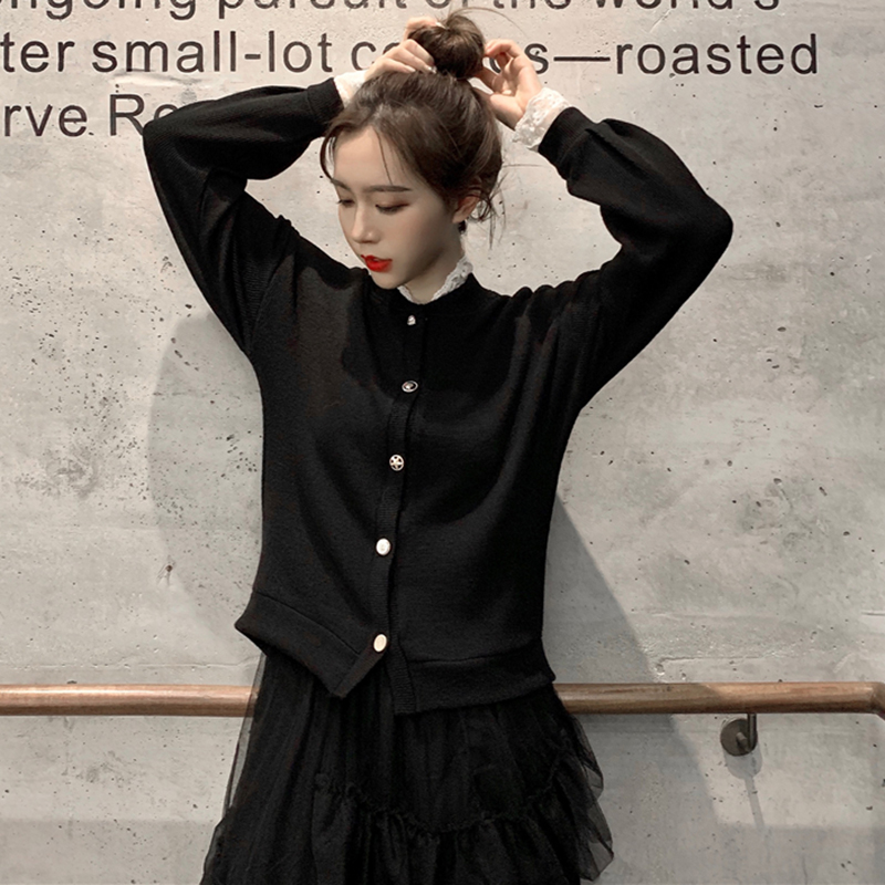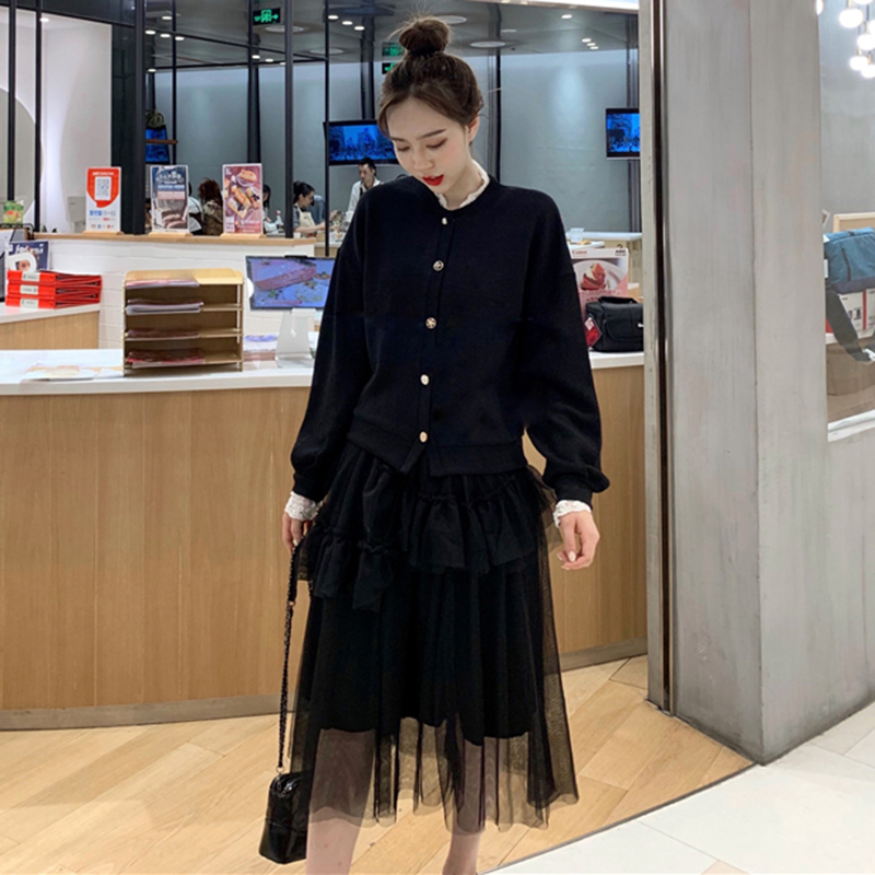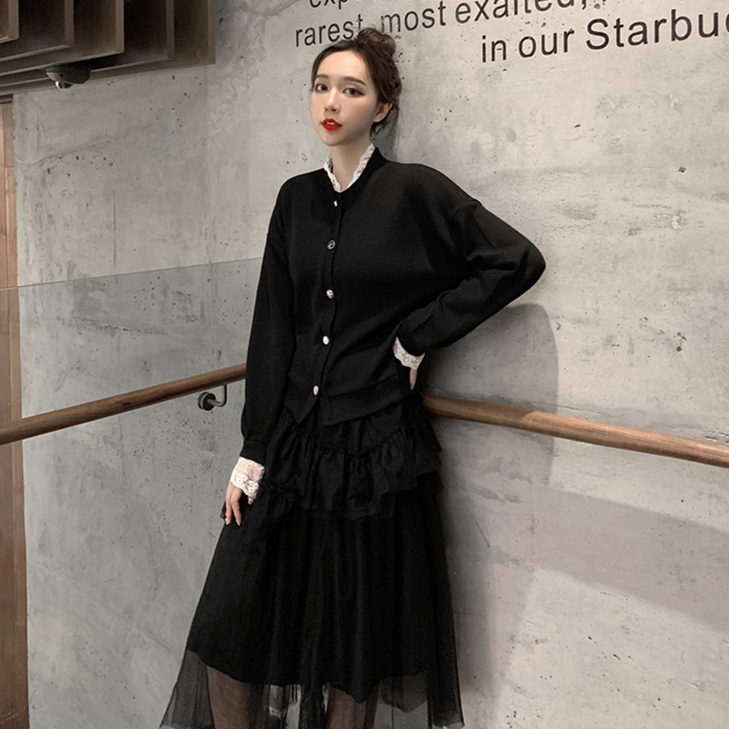 氣質女神兩件套秋冬裝新款時尚蕾絲拼接外套高腰顯瘦網紗A字裙子