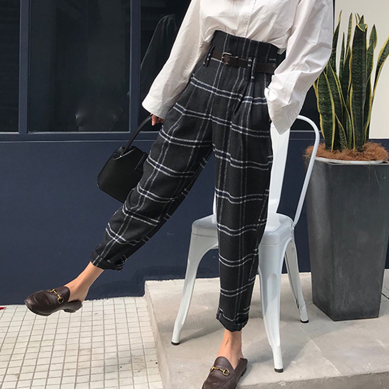 / 港味復古闊腿褲子女秋裝2018新款寬松格子休閑長褲高腰直筒西裝褲