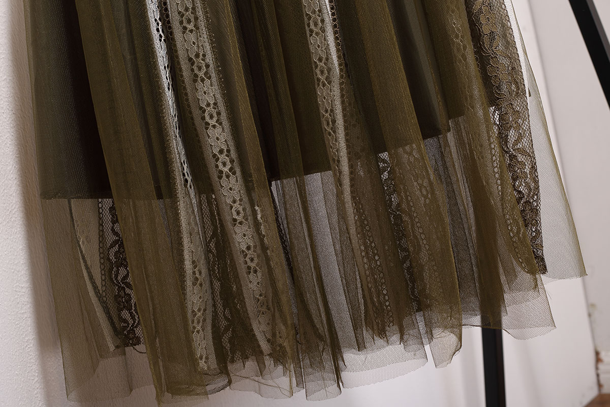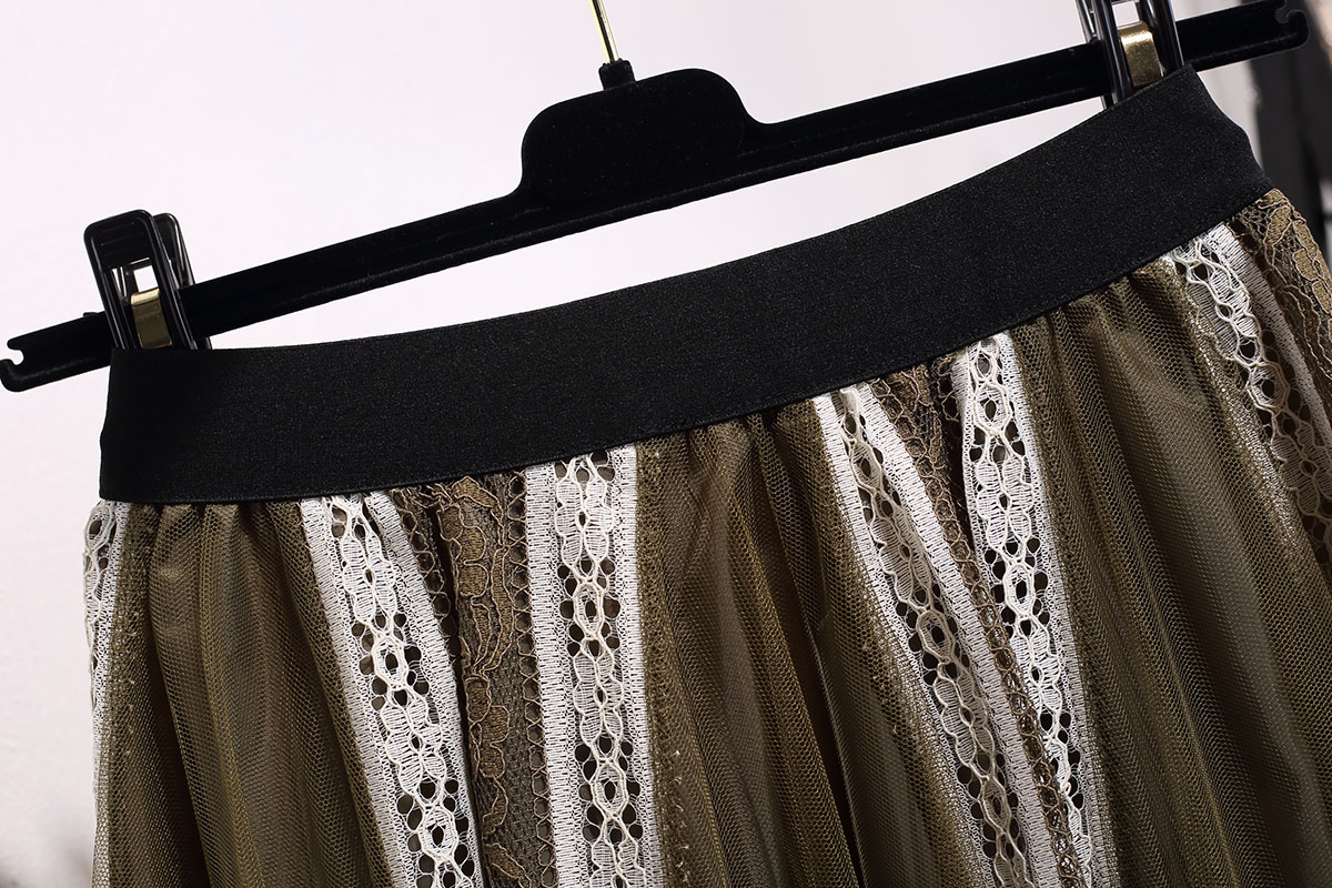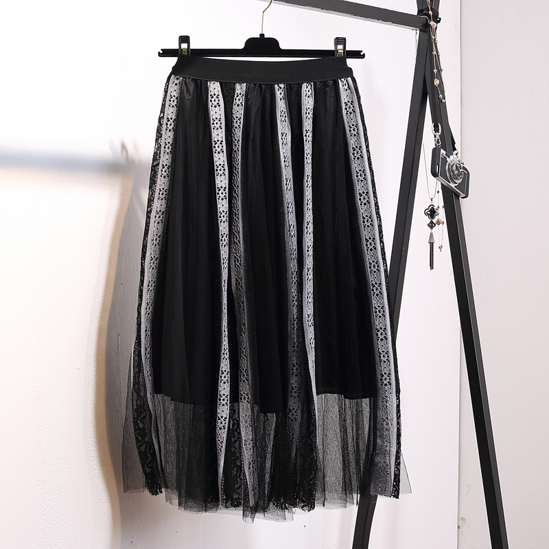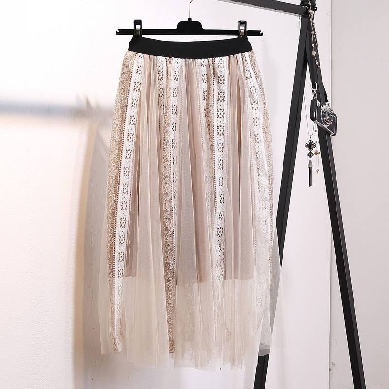 / 春夏季韓版中長款蕾絲拼接網紗裙高腰百搭百褶長裙半身裙子女