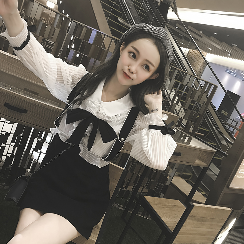 仙女甜美復古chic秋裝韓版修身長袖荷葉邊黑白拼接蝴蝶結連衣裙潮