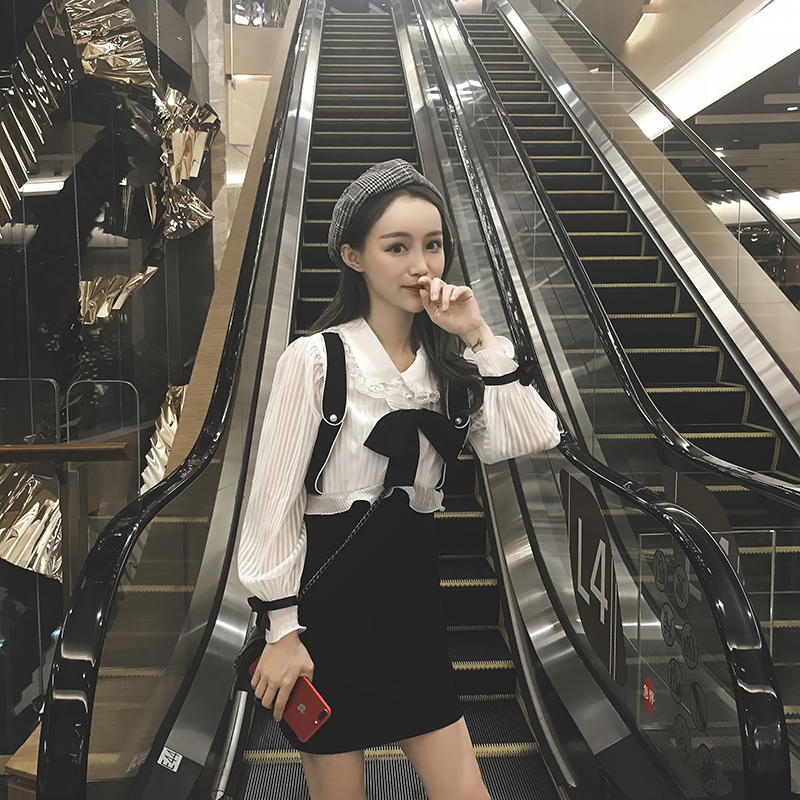 / 仙女甜美復古chic秋裝韓版修身長袖荷葉邊黑白拼接蝴蝶結連衣裙潮