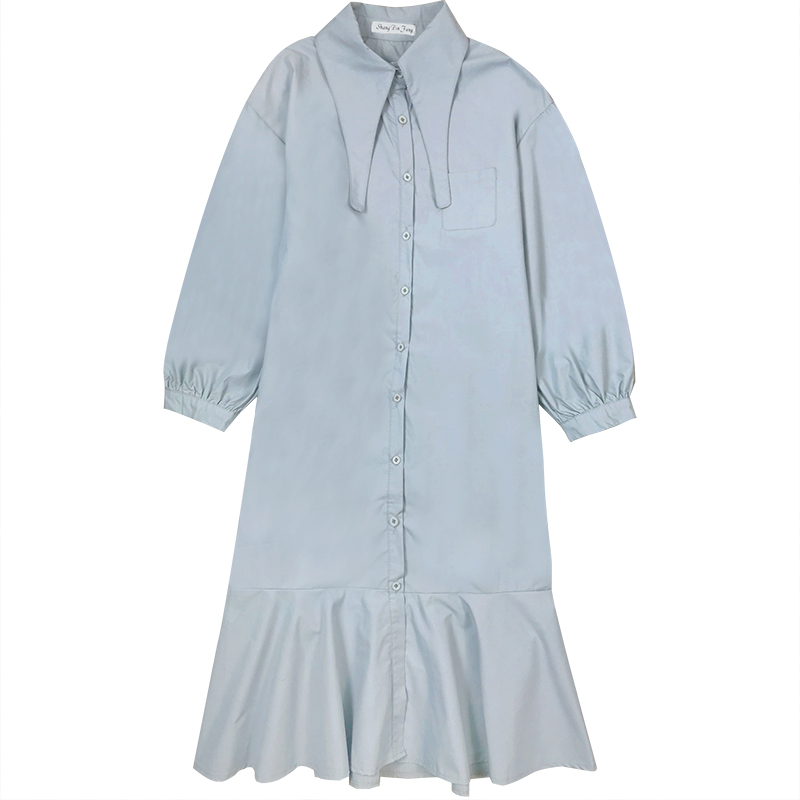 春季女裝新款韓版chic中長款翻領襯衫式連衣裙女學生荷葉邊魚尾裙