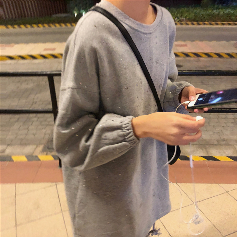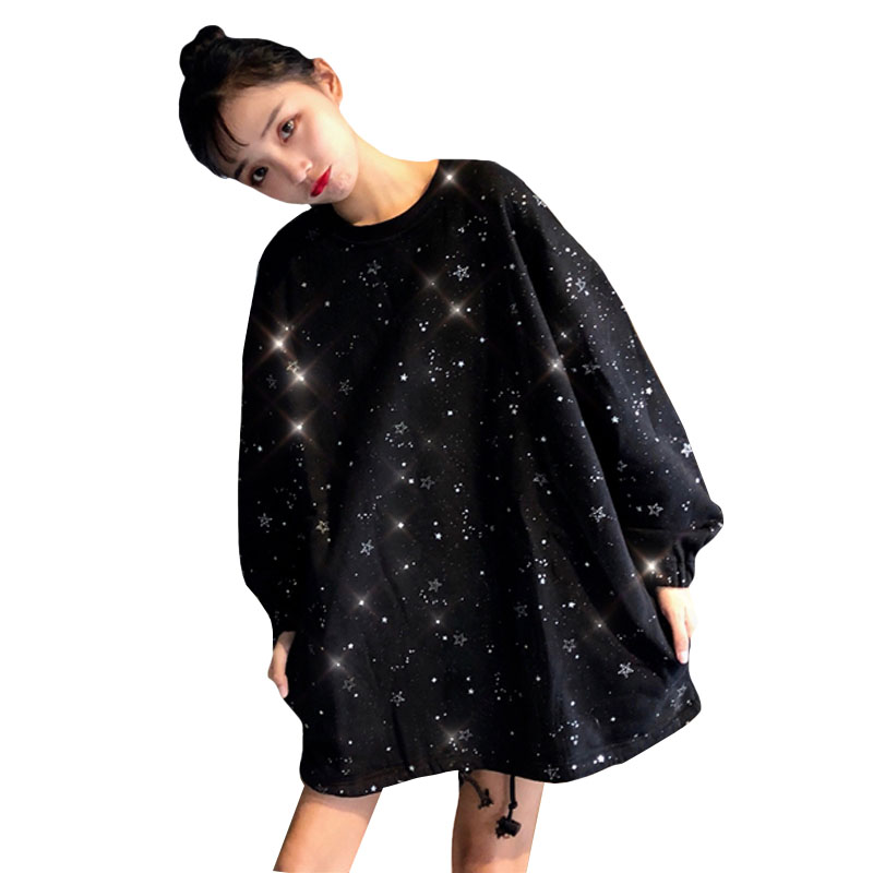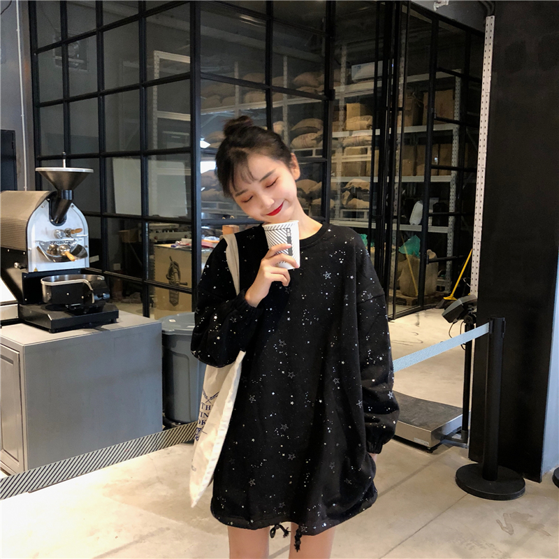 2018新款秋冬韓版中長款寬松閃亮星星加絨加厚套頭衛衣上衣外套女