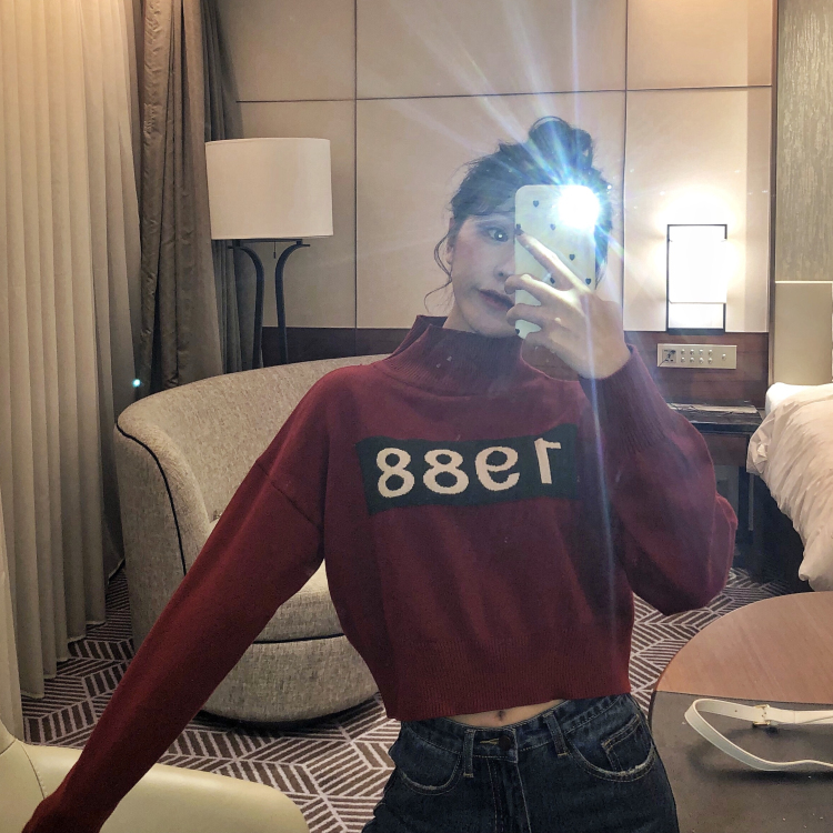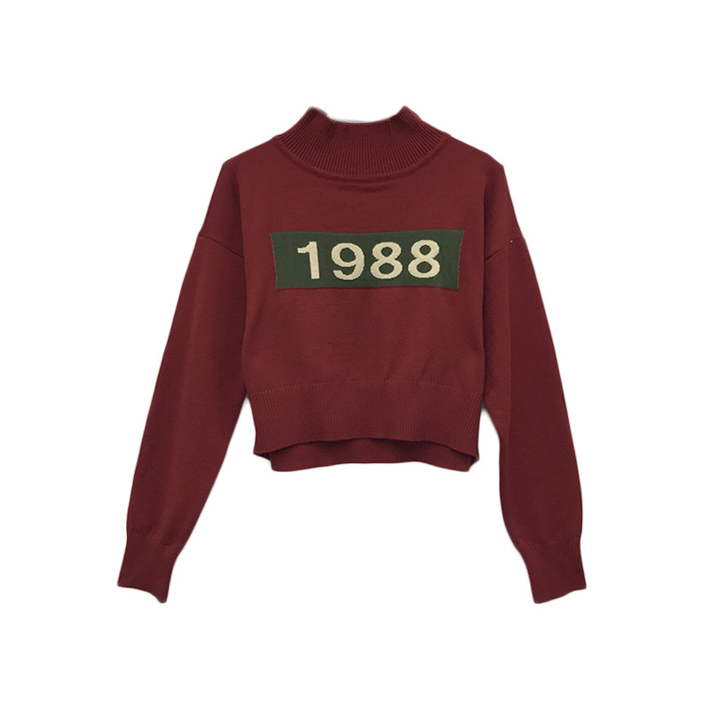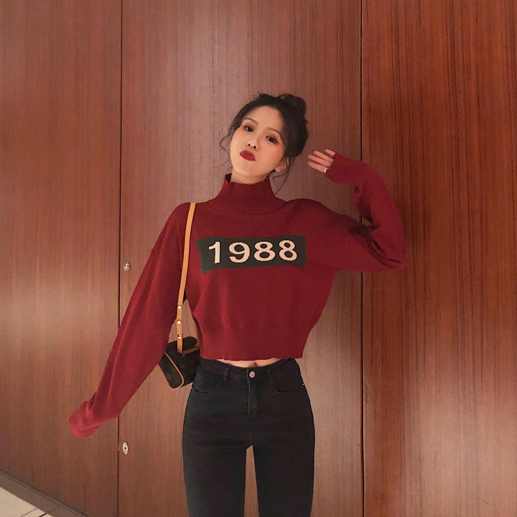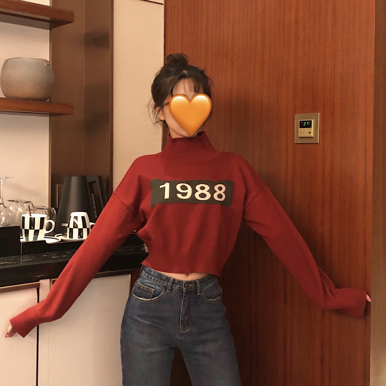 / 毛衣外套女韓版2018新款高領短款針織衫1988撞色圖案套頭女上衣潮