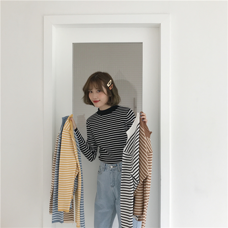 秋冬韓版條紋修身顯瘦上衣女打底衫chic套頭長袖針織衫半高領毛衣
