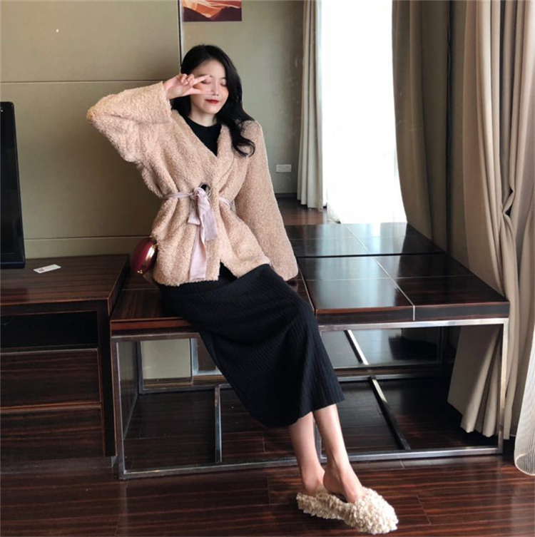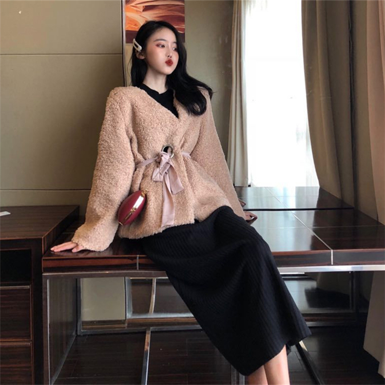 / 韓版加厚保暖寬松百搭羊羔毛大衣女+打底針織衫+半身裙時尚三件套