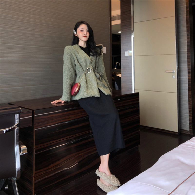 韓版加厚保暖寬松百搭羊羔毛大衣女+打底針織衫+半身裙時尚三件套