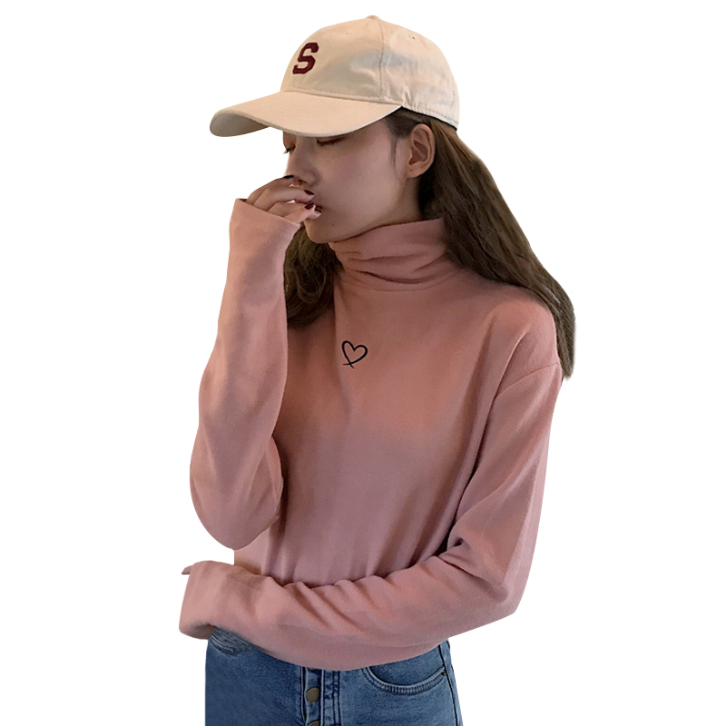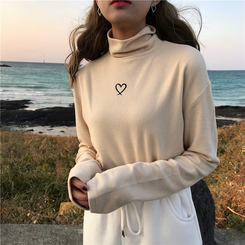秋冬韓版修身顯瘦愛心刺繡磨毛保暖高領打底衫長袖T恤上衣學生女