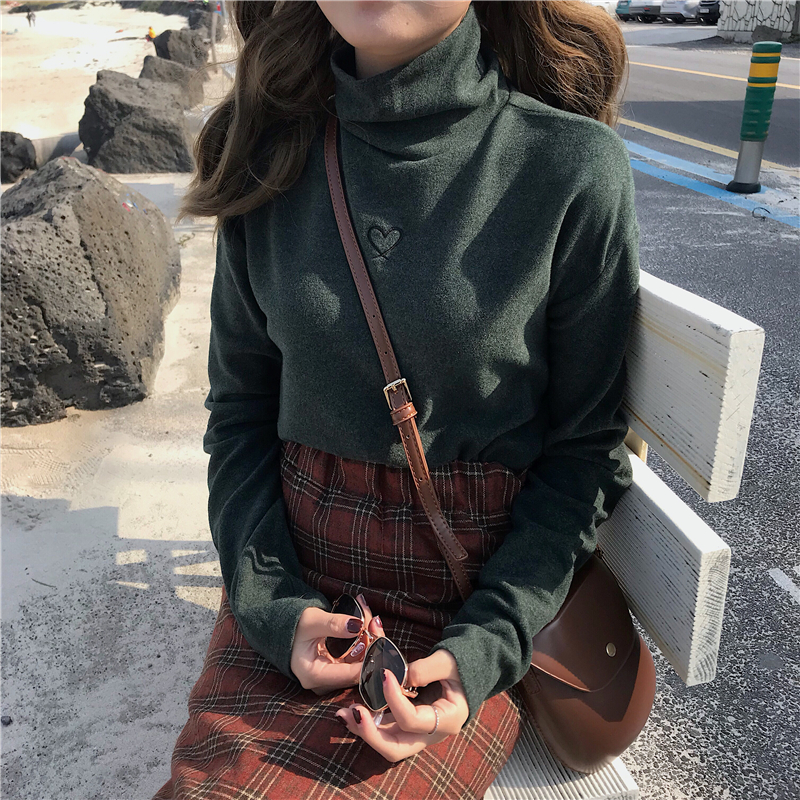 / 秋冬韓版修身顯瘦愛心刺繡磨毛保暖高領打底衫長袖T恤上衣學生女
