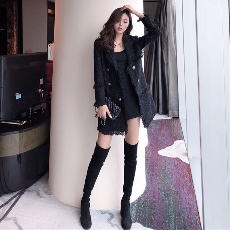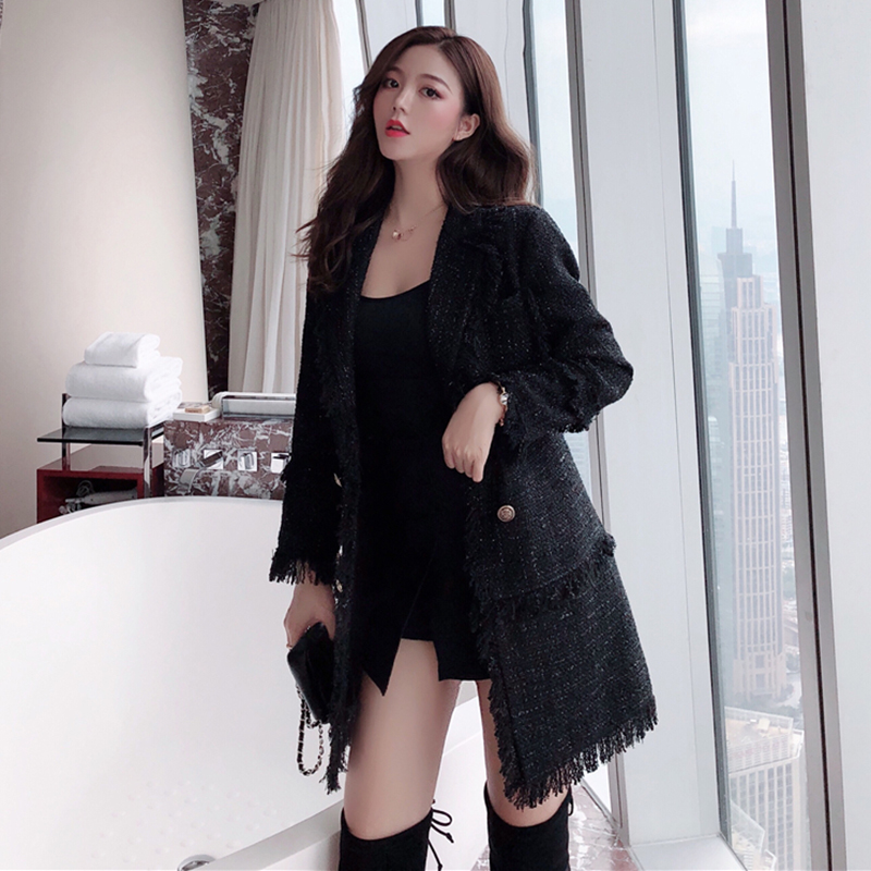 復古粗花呢大衣女秋冬裝2018新款小香風流蘇雙排扣中長款呢子外套