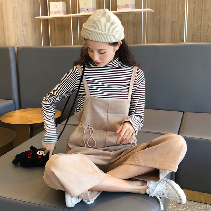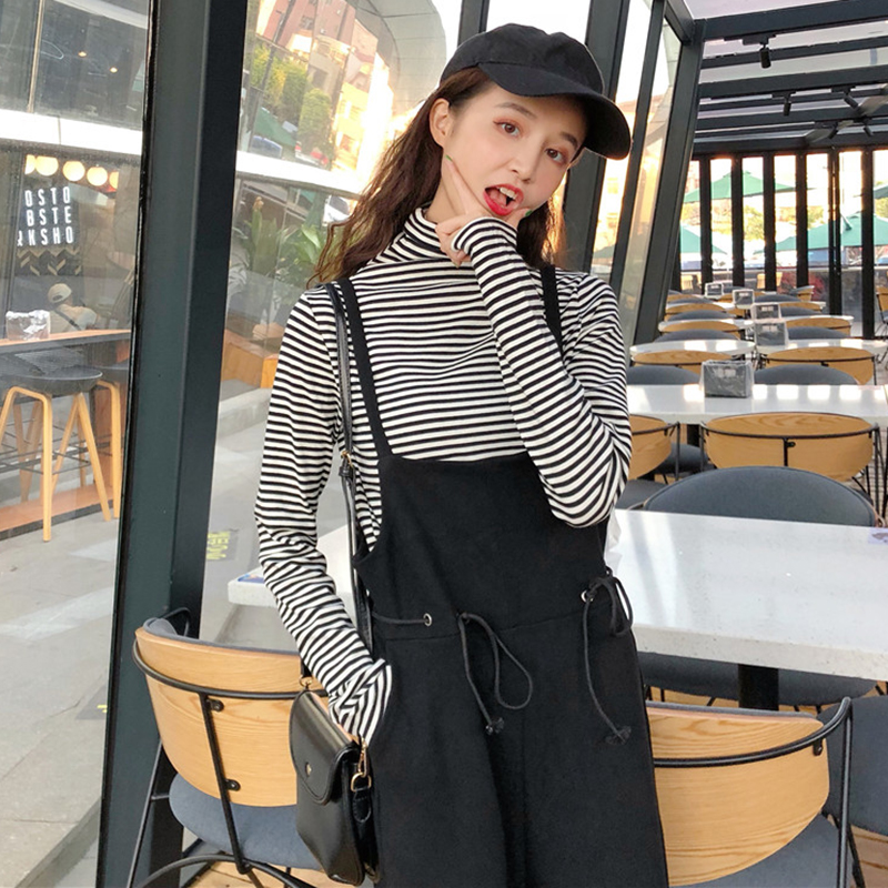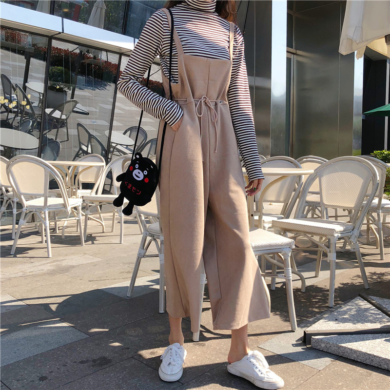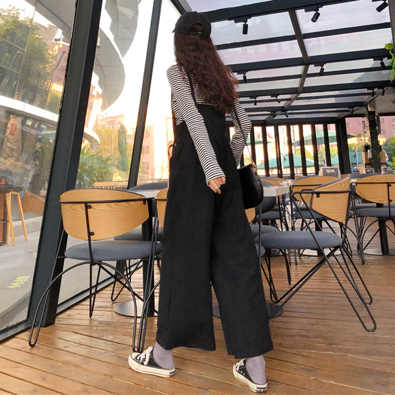 秋裝女2018新款韓版寬松休閑高腰闊腿背帶褲子學生時尚黑色連體褲