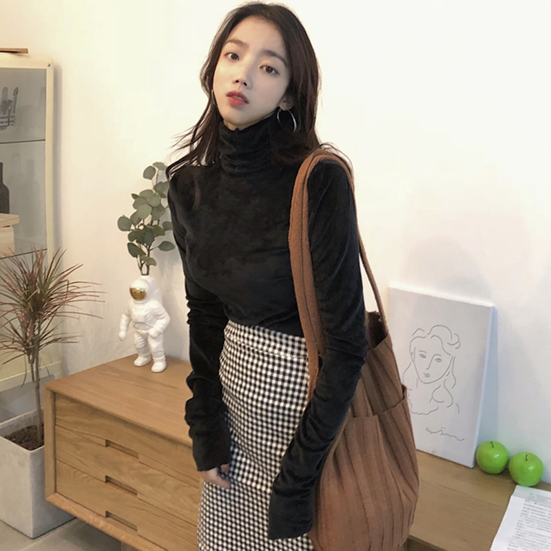 / 高領修身顯瘦打底衫女秋冬裝新款韓版絲絨黑色長袖上衣學院風T恤