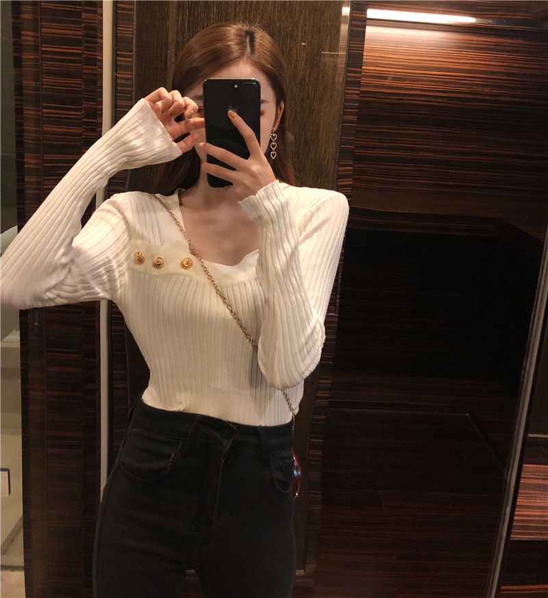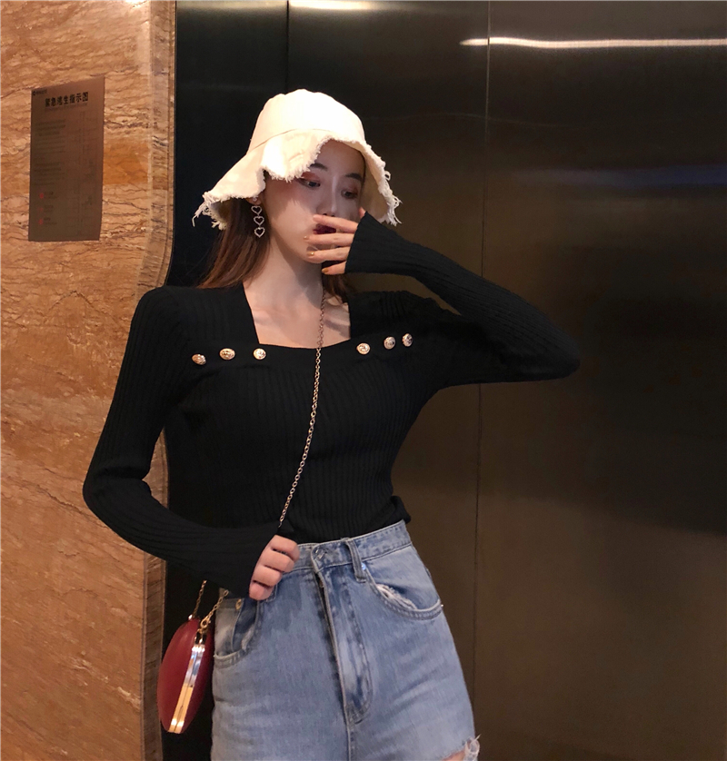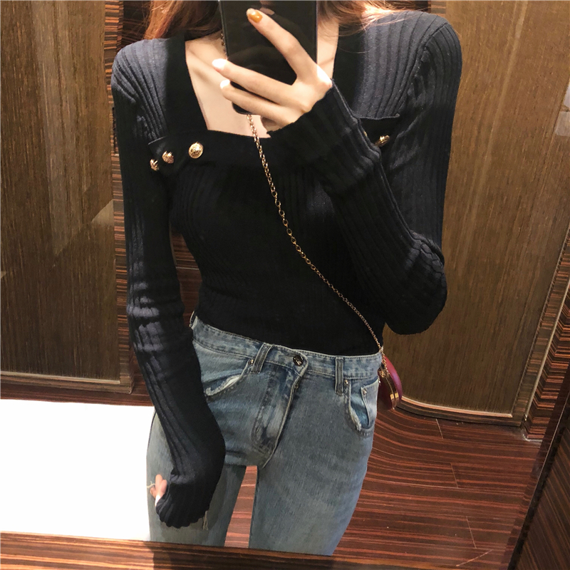 / 秋裝新款韓版chic復古百搭時尚打底衫港風修身顯瘦紐扣針織上衣女