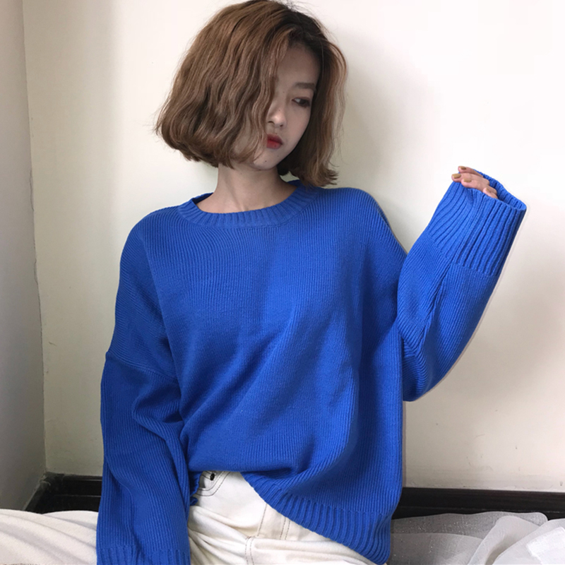 女秋裝2018新款簡約純色圓領打底毛衣學生慵懶寬松長袖開叉上衣潮