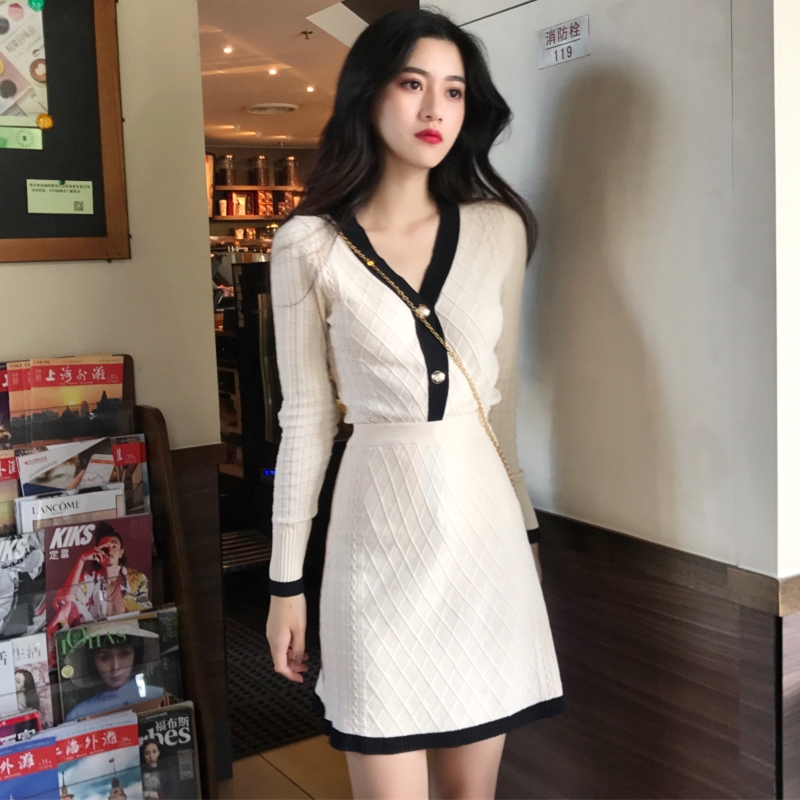 / 小香風新款秋季時尚兩件套V領排扣勾花開衫短裙針織氣質復古套裝