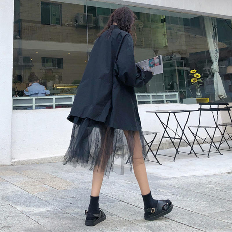 / 復古港味風上衣外套女秋冬裝2018新款中長款下擺網紗拼接長袖襯衫