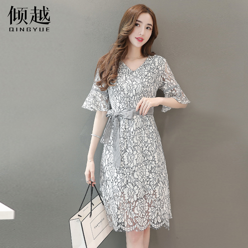 / 2017夏裝新款韓版氣質喇叭袖連衣裙女修身高腰勾花顯瘦中長蕾絲裙