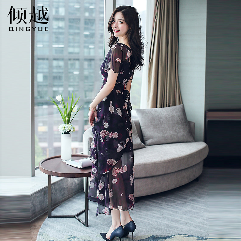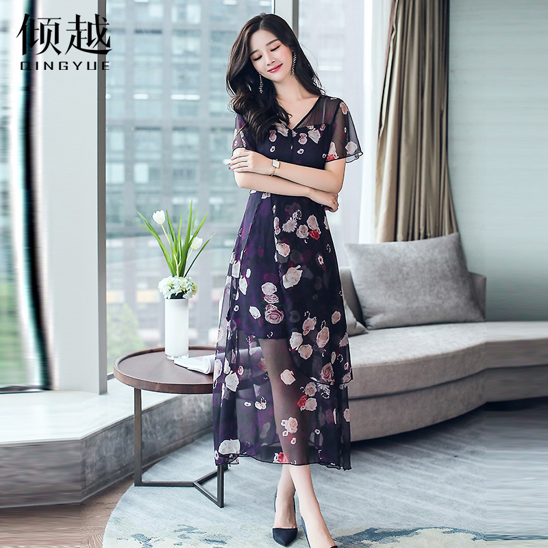 / 印花雪紡連衣裙女夏2017新款韓版透視顯瘦短袖氣質V領大擺長裙子