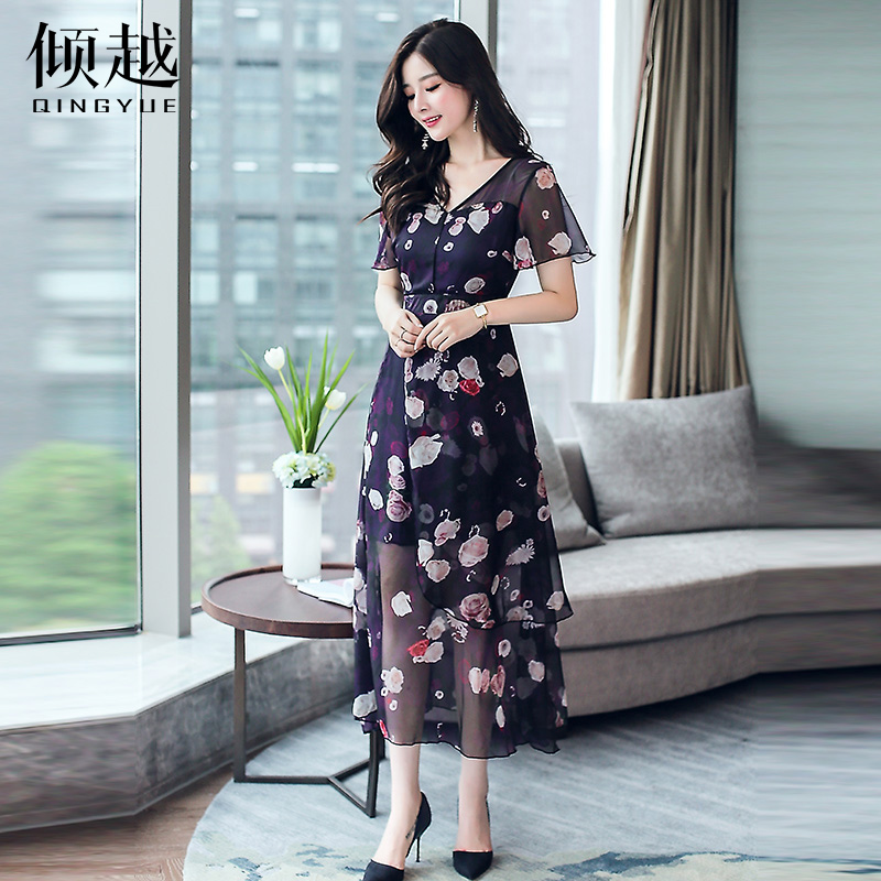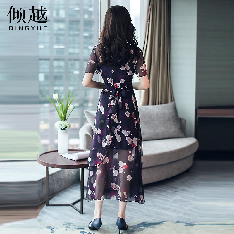 印花雪紡連衣裙女夏2017新款韓版透視顯瘦短袖氣質V領大擺長裙子