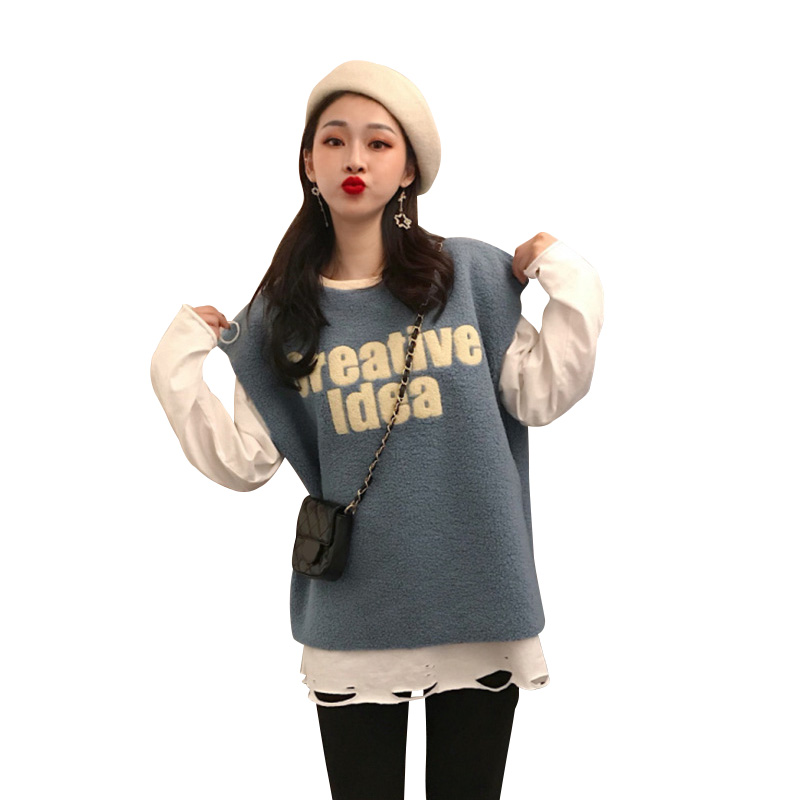 2018秋冬新款韓版時尚套裝寬松馬甲長袖破洞設計感T恤女兩件套潮