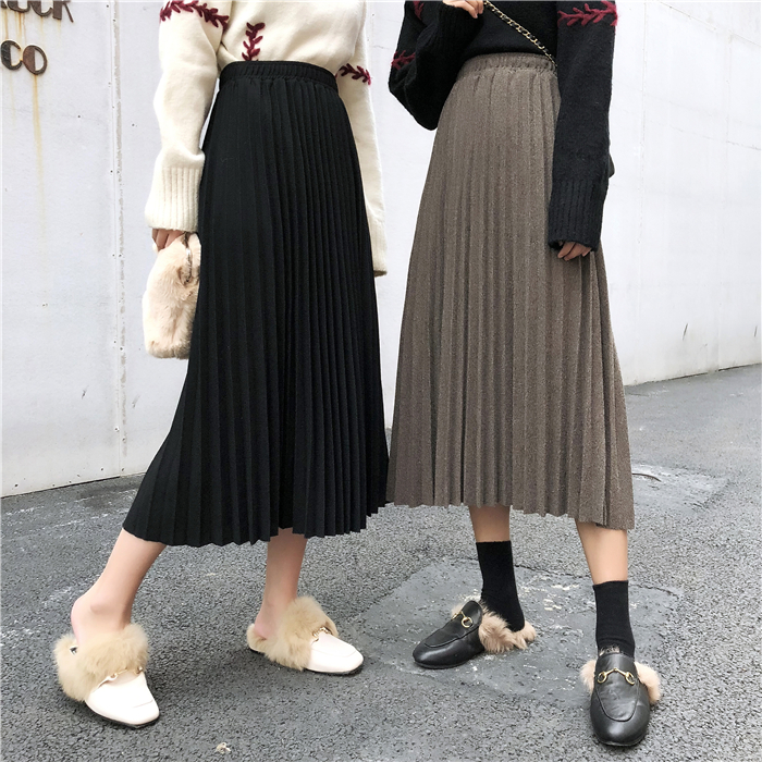 復古時尚女裝高腰針織半身裙秋冬2018新款中長款顯瘦A字百褶裙潮