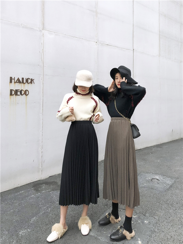 / 復古時尚女裝高腰針織半身裙秋冬2018新款中長款顯瘦A字百褶裙潮