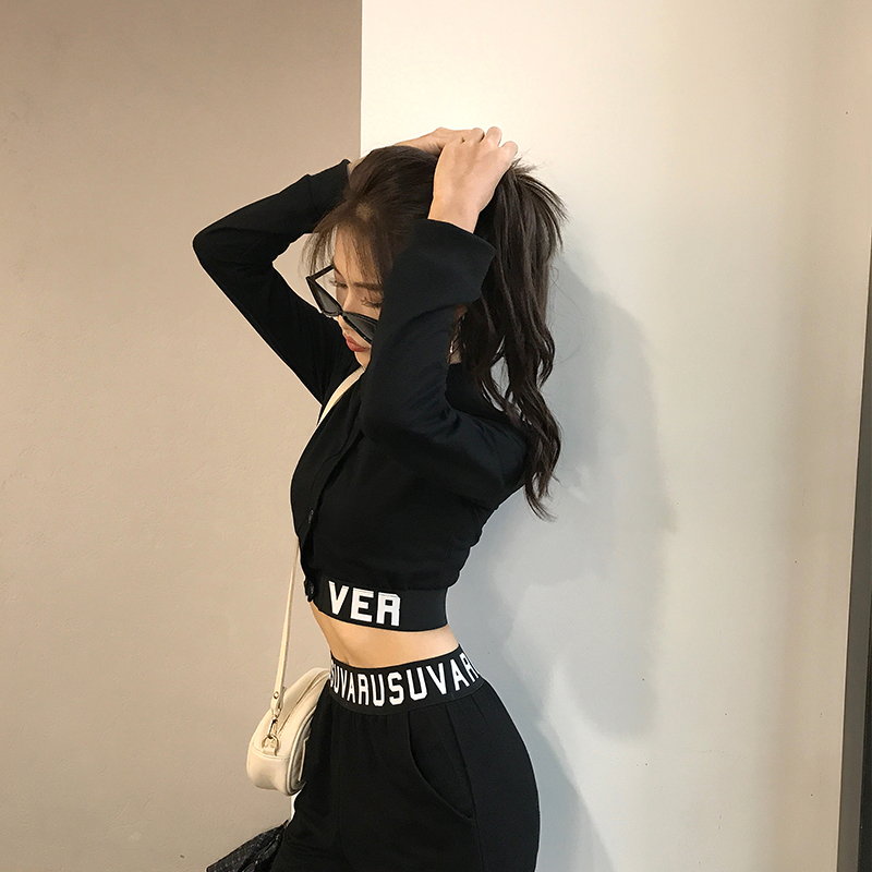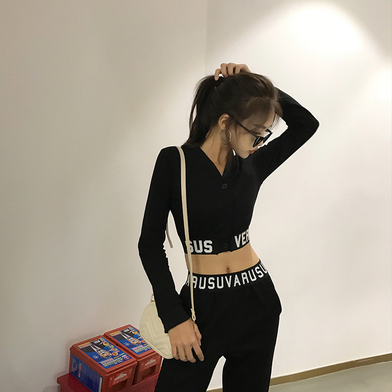 / 2018秋裝新款韓版休閑運動套裝短款V領露臍上衣高腰長褲兩件套女