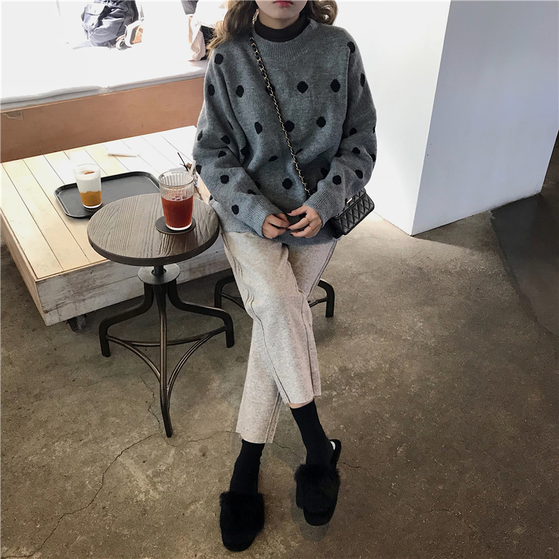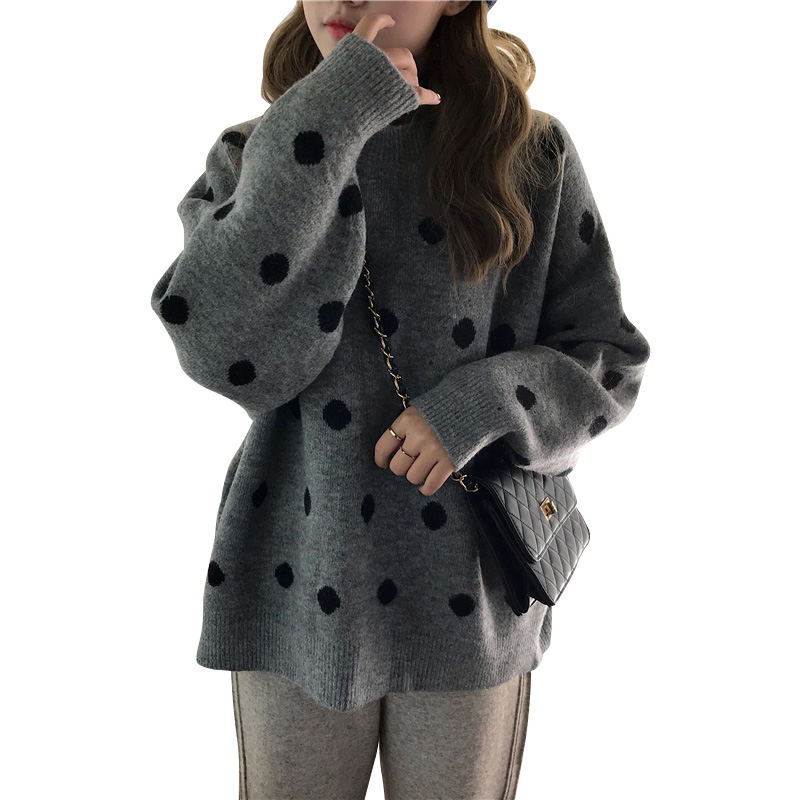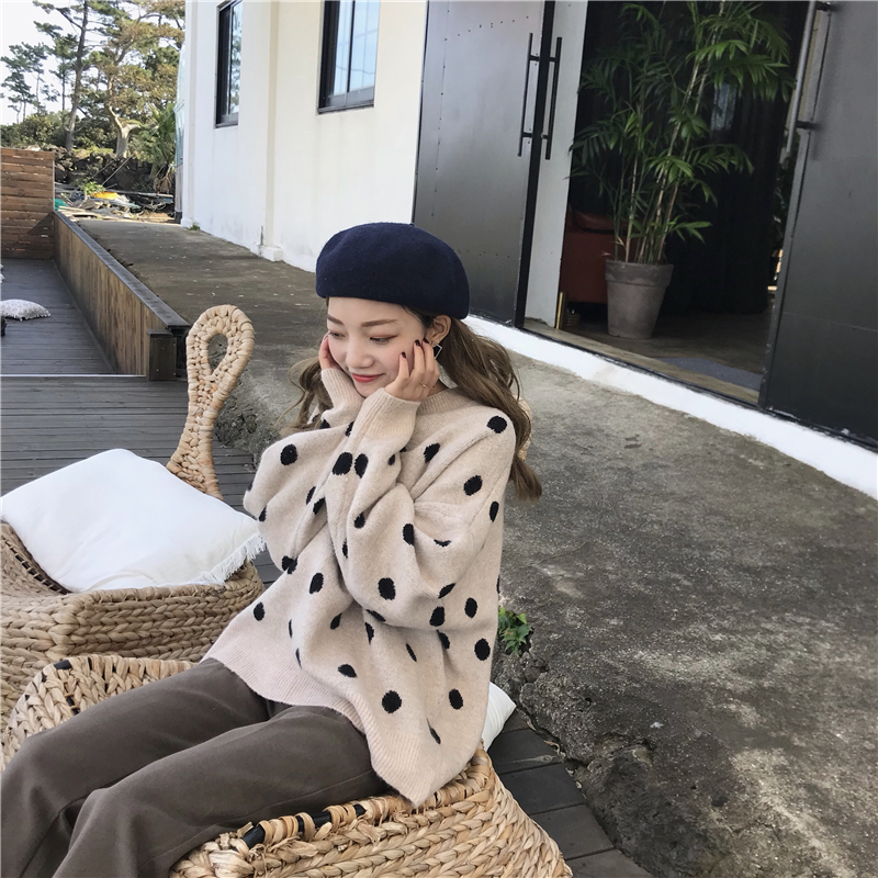 / 新款韓版復古波點寬松顯瘦秋冬上衣女百搭長袖chic圓領套頭毛衣女