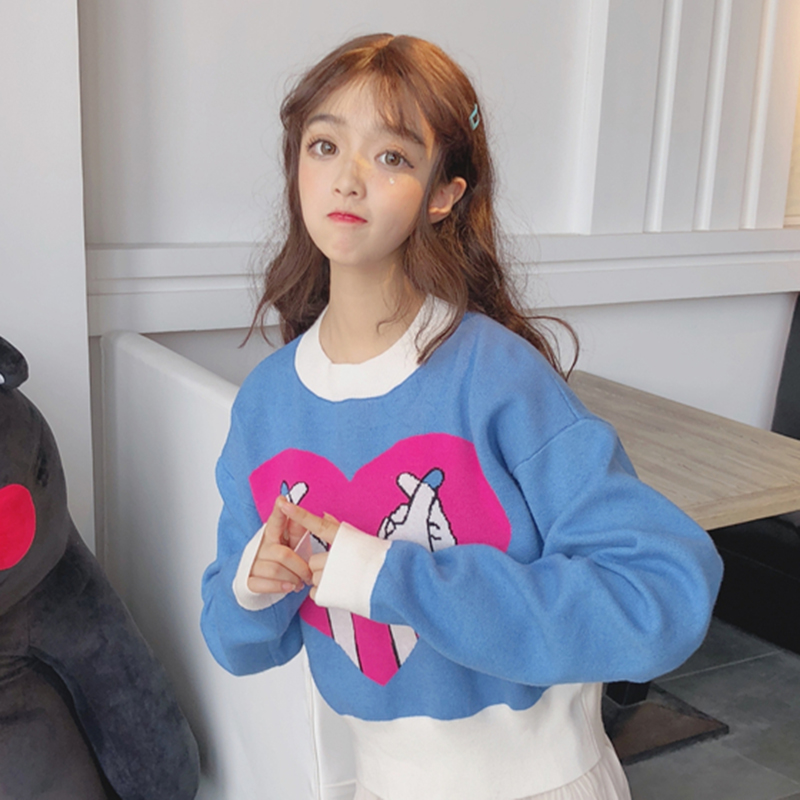 / 怪味少女愛心撞色套頭加絨衛衣秋冬裝2018新款韓版百搭寬松短外套