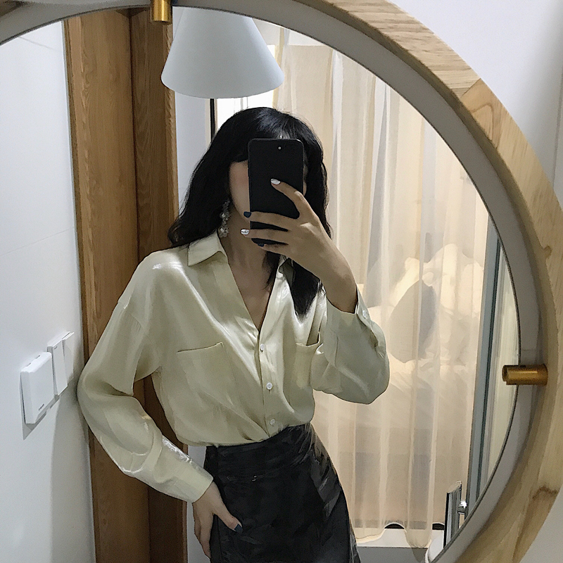 / 韓版時尚新款百搭chic早秋上衣慵懶寬松顯瘦性感v領珠光長袖襯衫