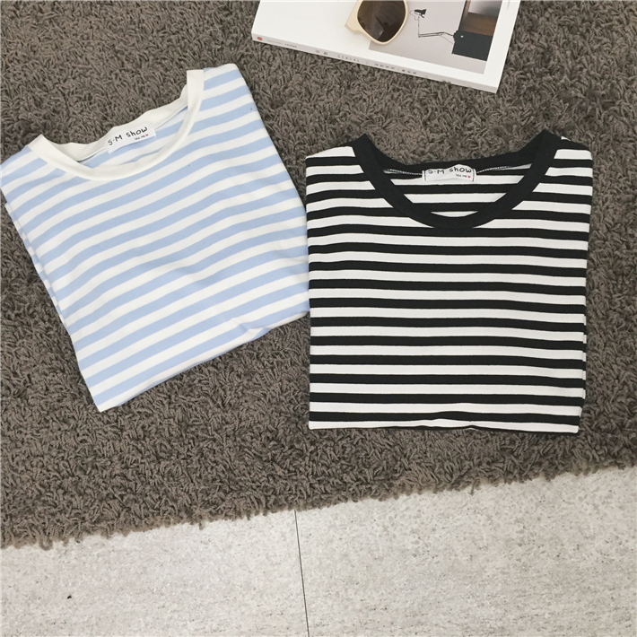 / 秋款韓國學院風寬松顯瘦百搭條紋圓領套頭打底衫上衣T恤女