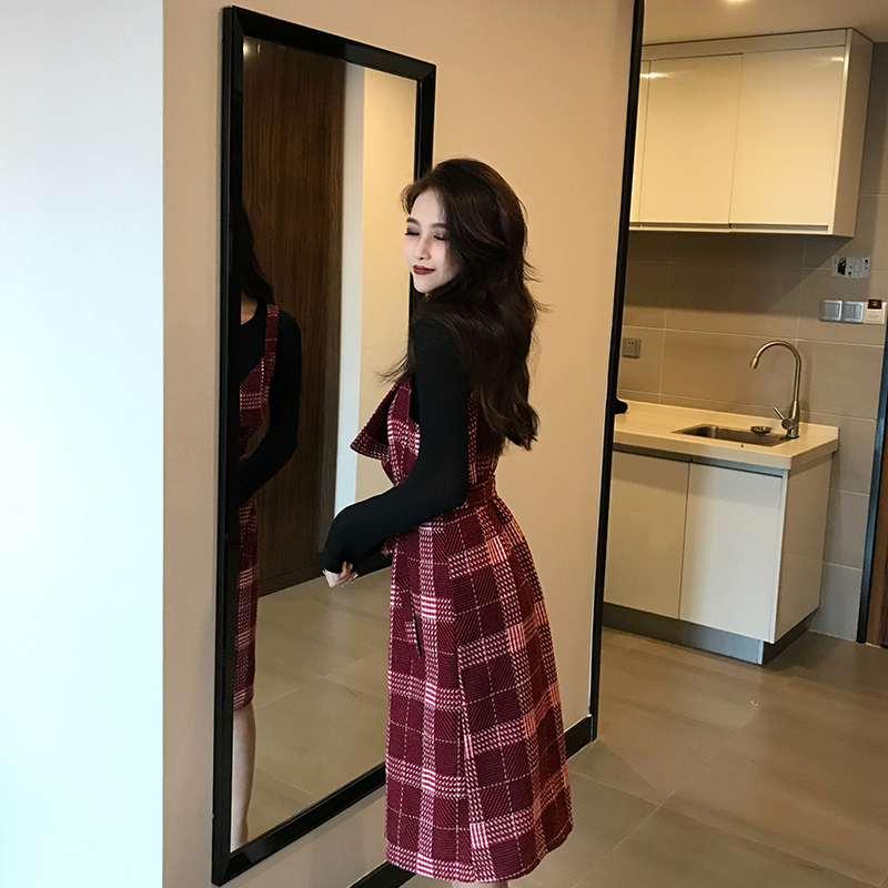 2018秋季新款韓版格子雙排扣吊帶裙設計感百搭女裝開衫外套連衣裙