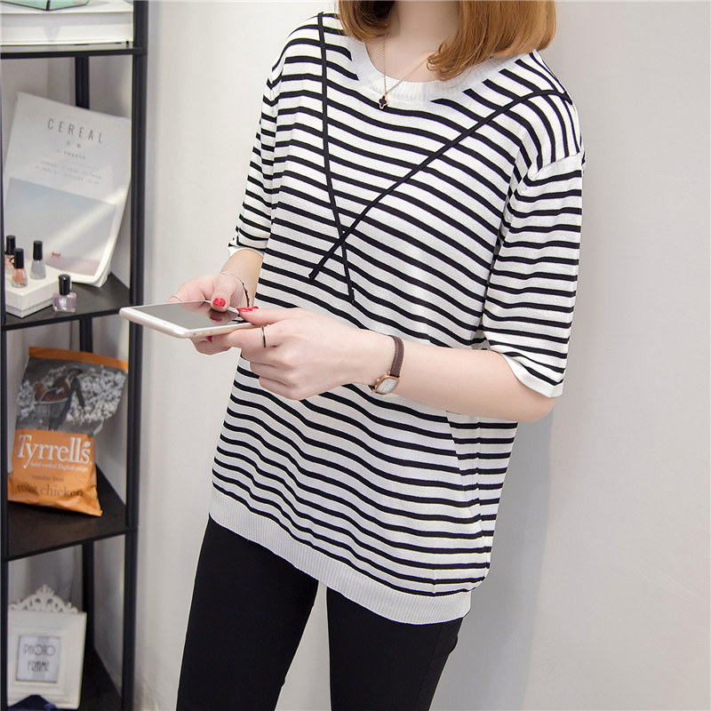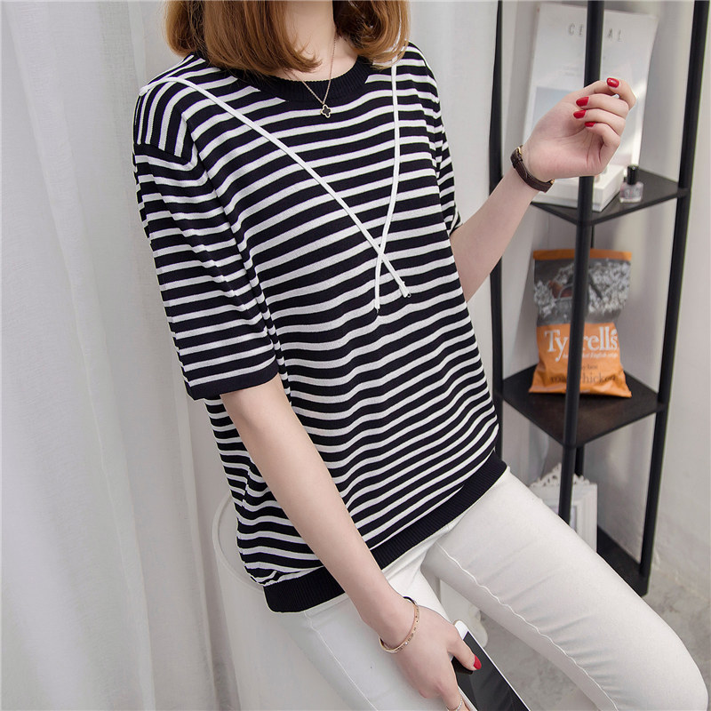 / 條紋針織衫女上衣寬松套頭薄款短袖針織打底衫春季女裝新款潮