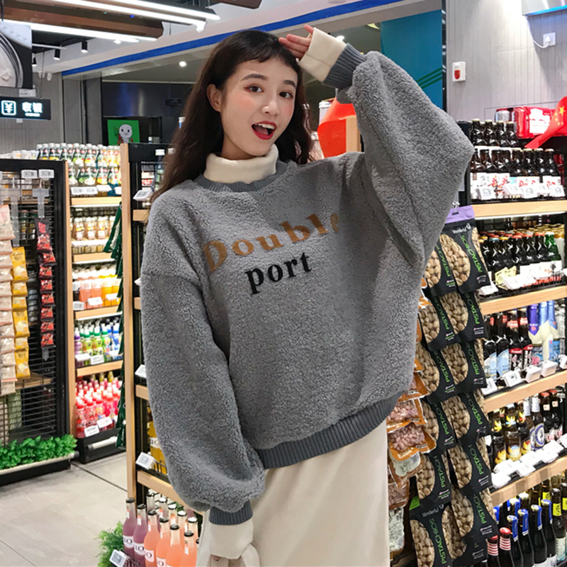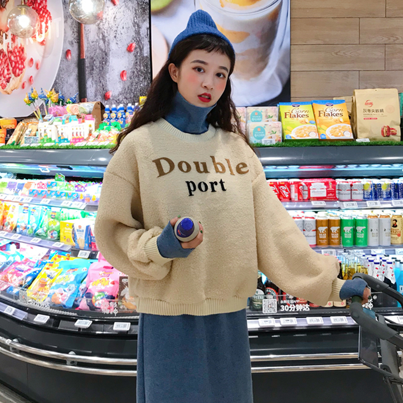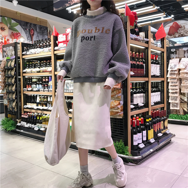 洋氣套裝女秋冬新款韓版毛衣拼接仿羊羔毛衛衣外套加高腰半身裙子