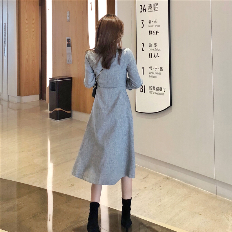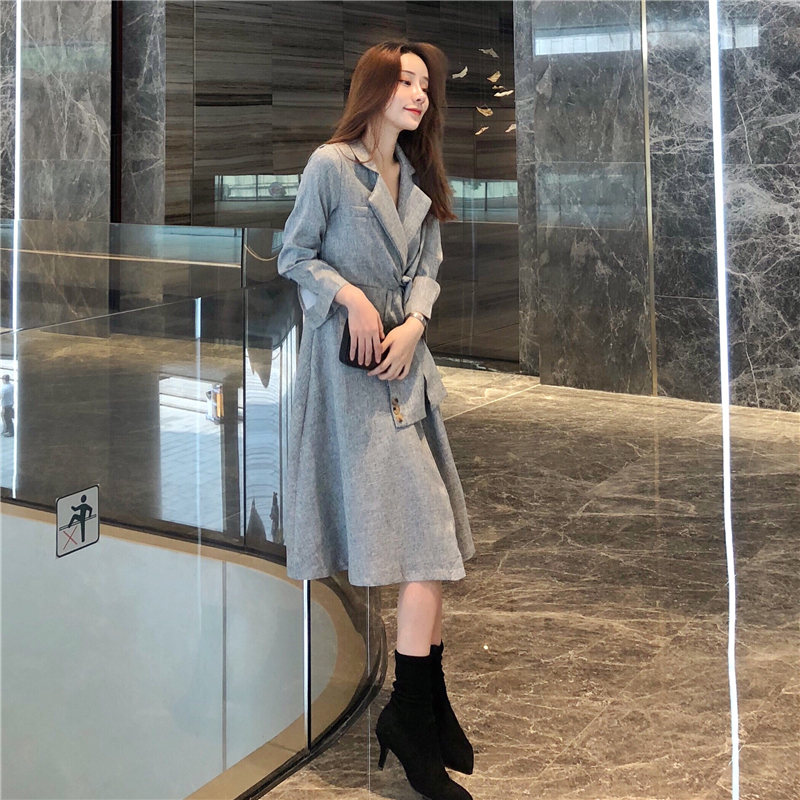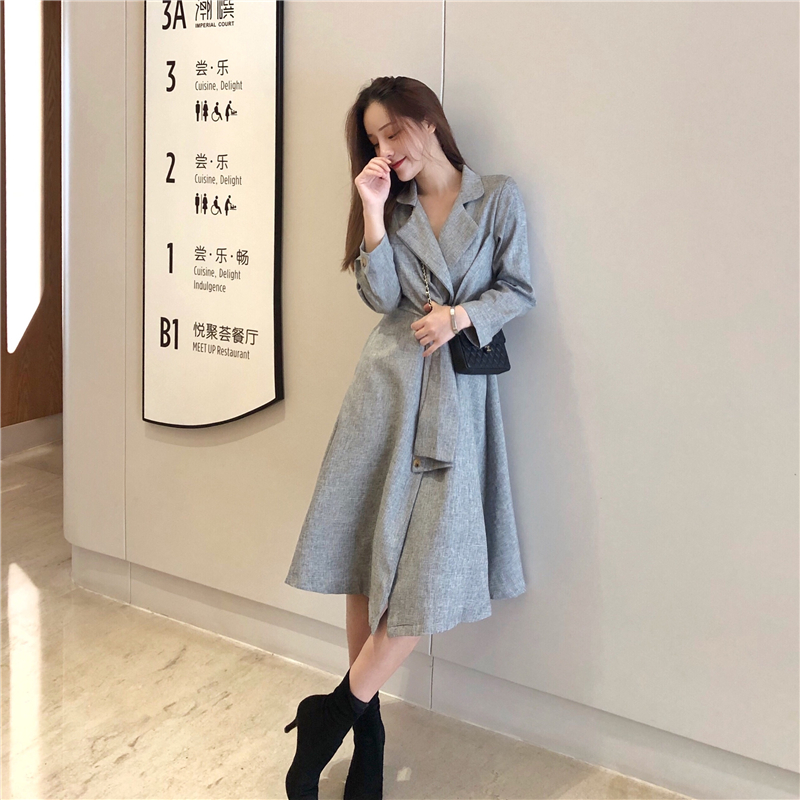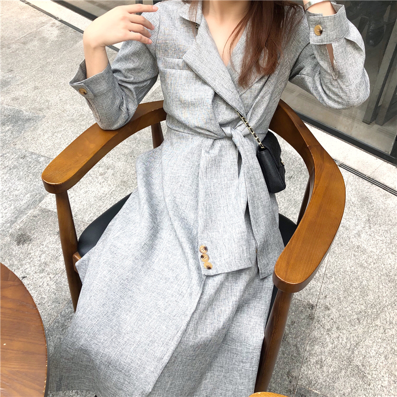 2018新款小香風設計感扭結系帶假袖子大翻領氣質大擺風衣裙外套潮