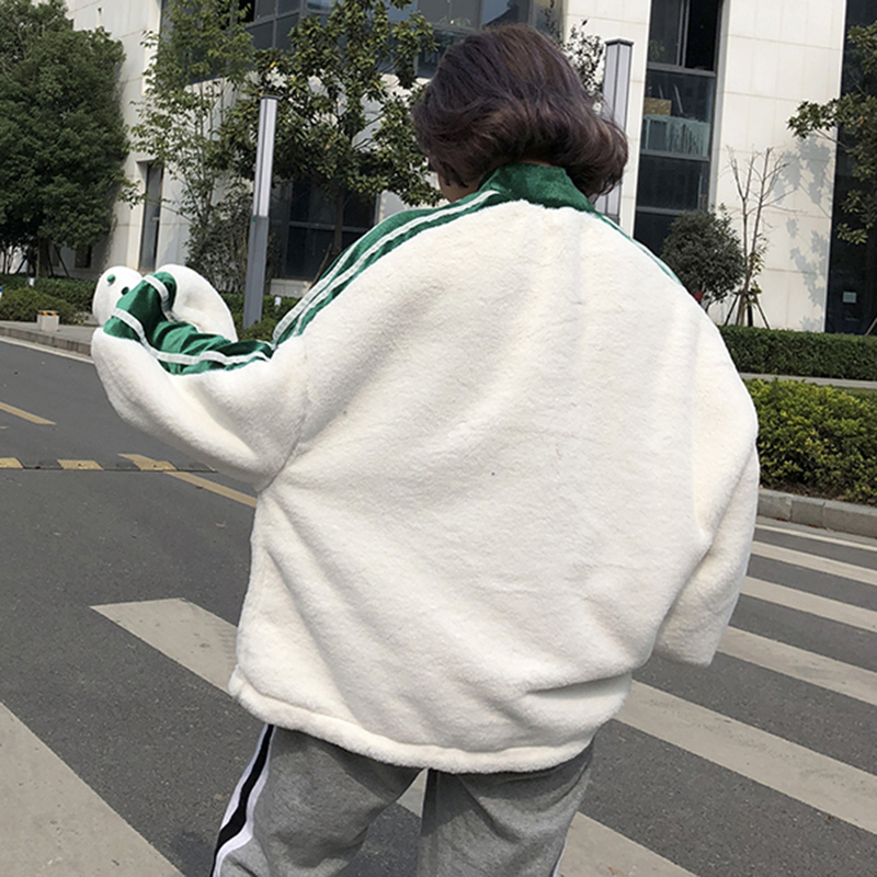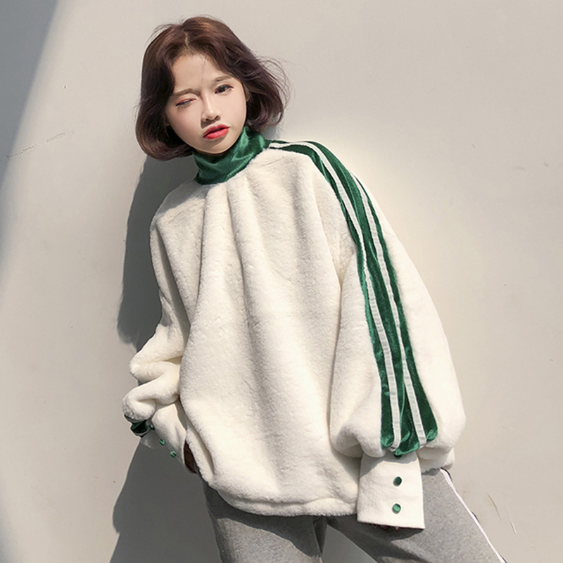 / 時尚拼接條紋毛絨絨上衣秋冬女裝新款寬松燈籠長袖衛衣小高領外套