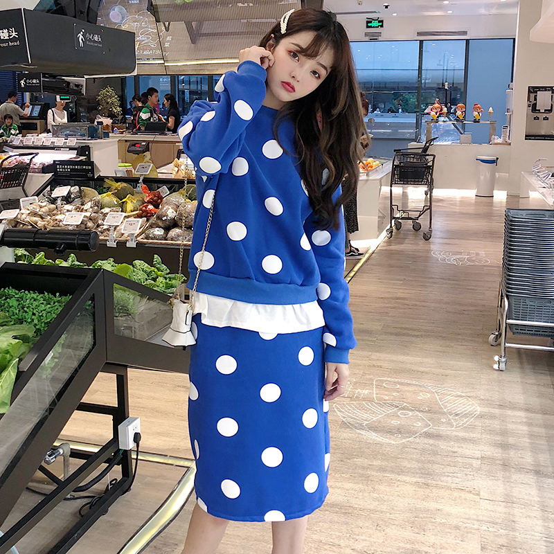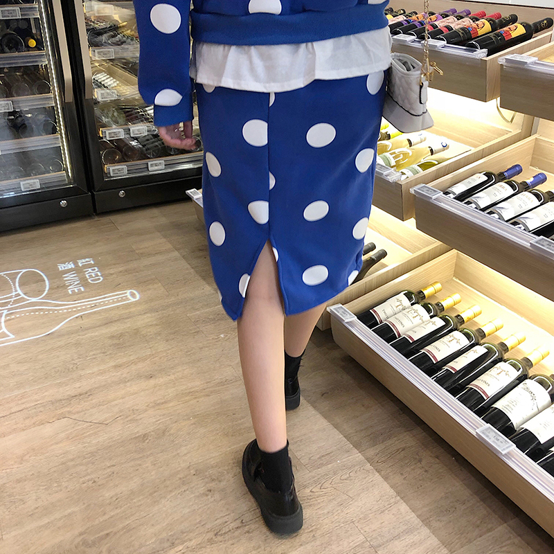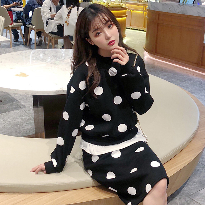 / 御姐套裝女秋冬新款波點復古風拼接衛衣外套高腰顯瘦開叉半身裙子