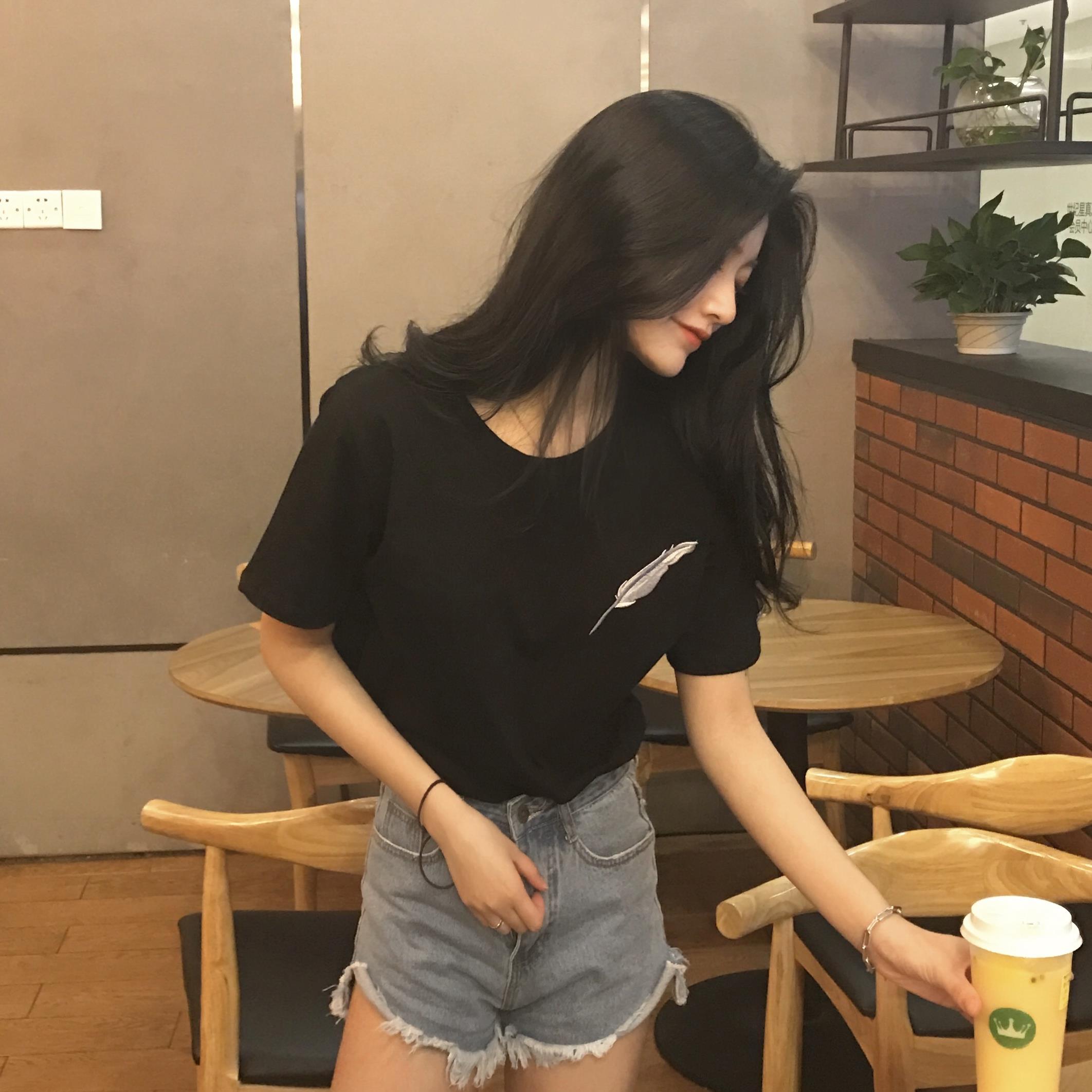 夏裝2018新款女羽毛刺繡百搭圓領顯瘦上衣氣質小寬松短袖套頭T恤